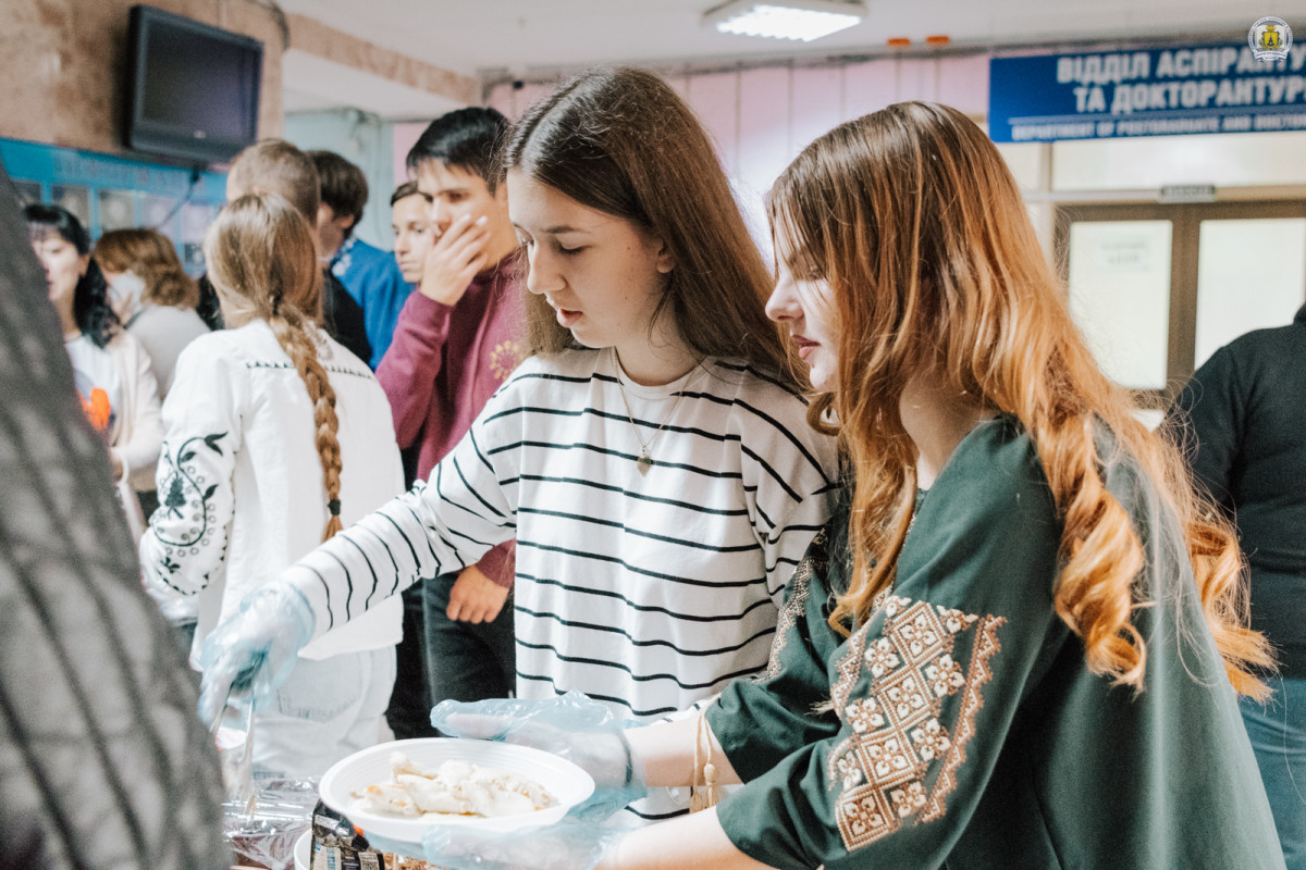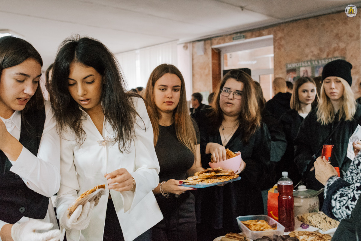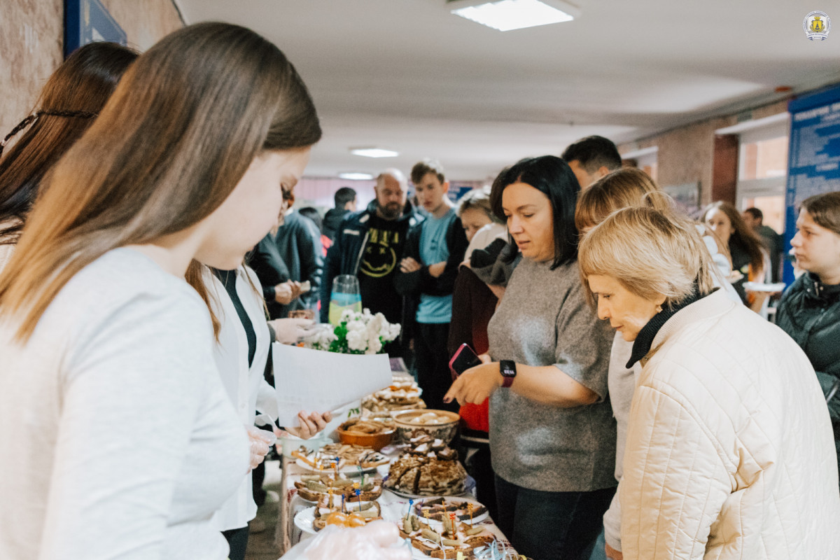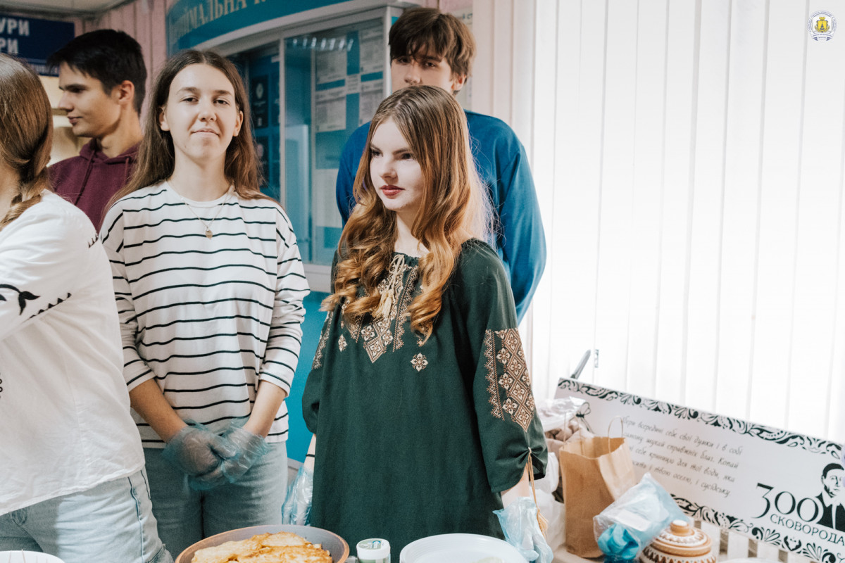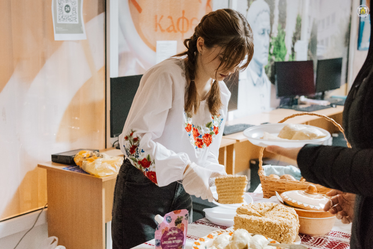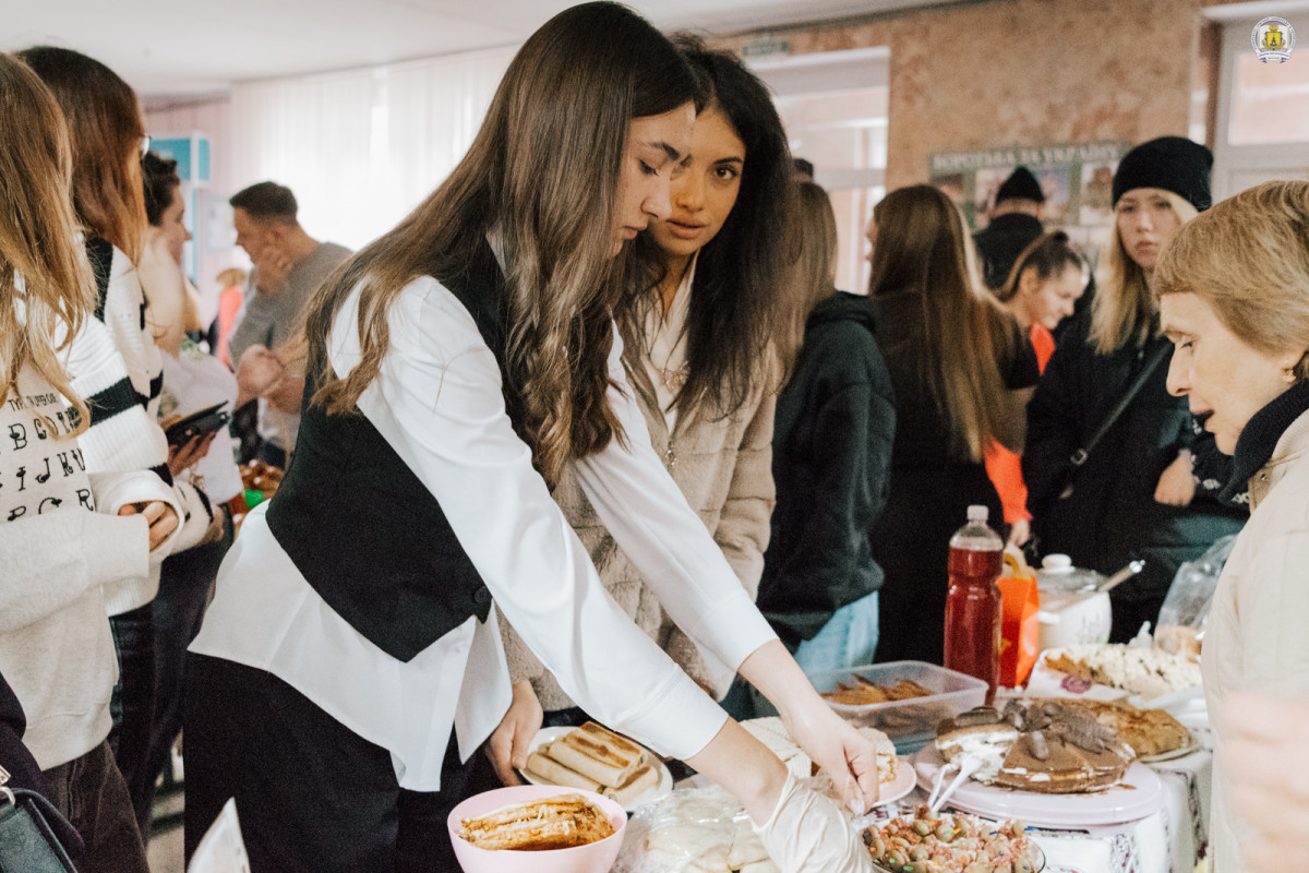 Близько опівдня, на великій перерві, на першому поверсі головного корпусу університету було направду велелюдно – тут набирала обертів виставка-ярмарок страв національної кухні. З-поміж страв якими могли почастуватися сковородинівці та гості були й смачні солоні та солодкі вареники й млинці, запашні канапки й пироги з різною начинкою, домашні ковбаски, наваристий борщ, соковиті голубці та ще багато різноманітних наїдків. Безумовно, кожен з факультетів та його представників заздалегідь продумував, який асортимент товару запропонує до продажу, як оформить своє торгове місце, як буде закликати потенційних покупців аби акумулювати якнайбільше коштів захисникам.