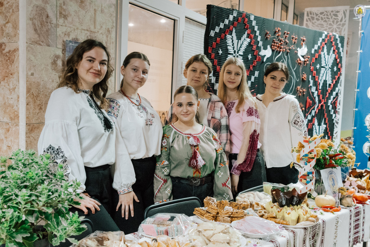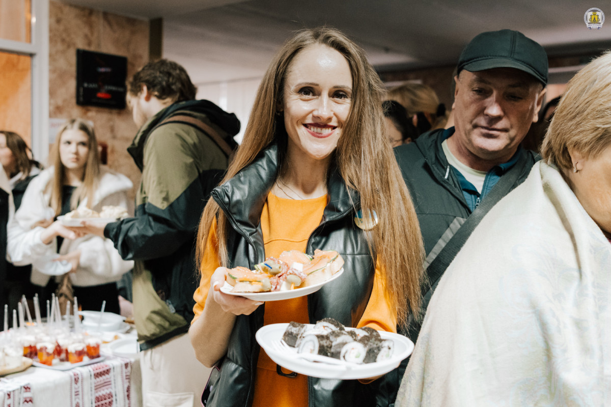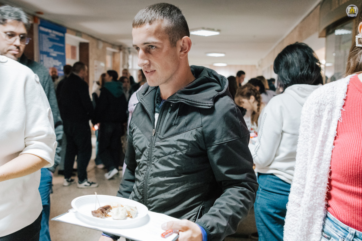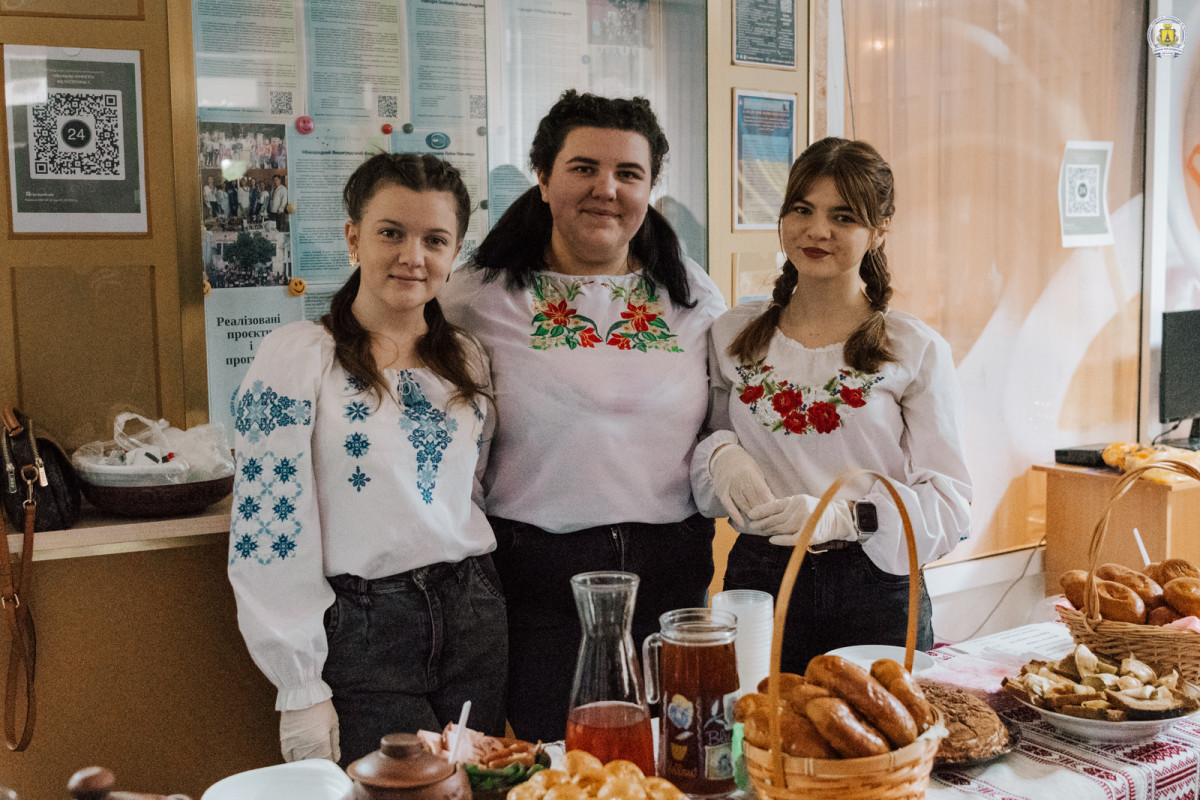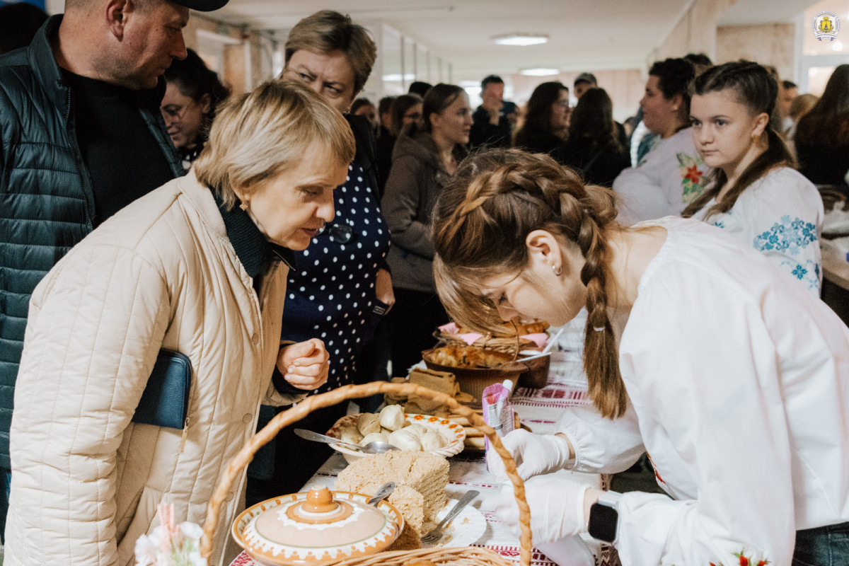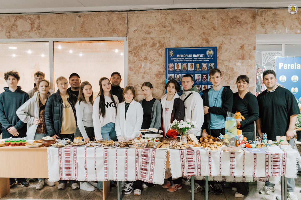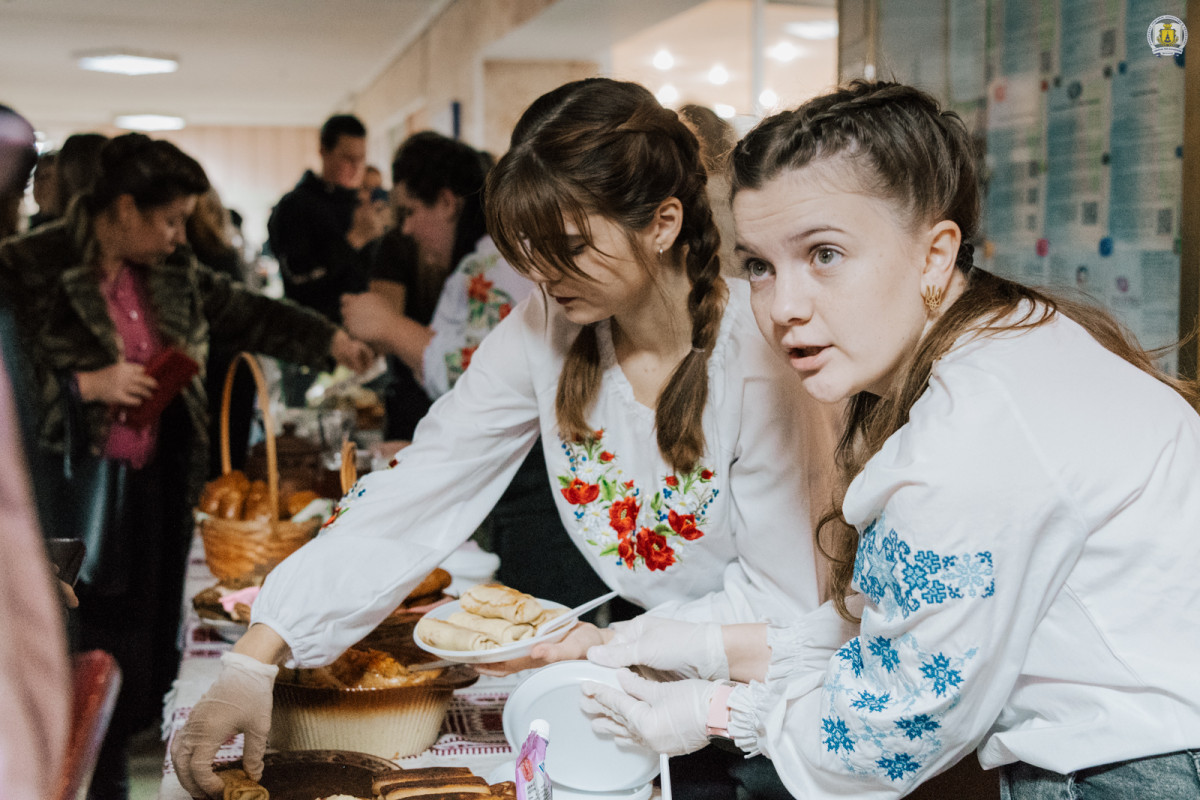 Близько опівдня, на великій перерві, на першому поверсі головного корпусу університету було направду велелюдно – тут набирала обертів виставка-ярмарок страв національної кухні. З-поміж страв якими могли почастуватися сковородинівці та гості були й смачні солоні та солодкі вареники й млинці, запашні канапки й пироги з різною начинкою, домашні ковбаски, наваристий борщ, соковиті голубці та ще багато різноманітних наїдків. Безумовно, кожен з факультетів та його представників заздалегідь продумував, який асортимент товару запропонує до продажу, як оформить своє торгове місце, як буде закликати потенційних покупців аби акумулювати якнайбільше коштів захисникам.