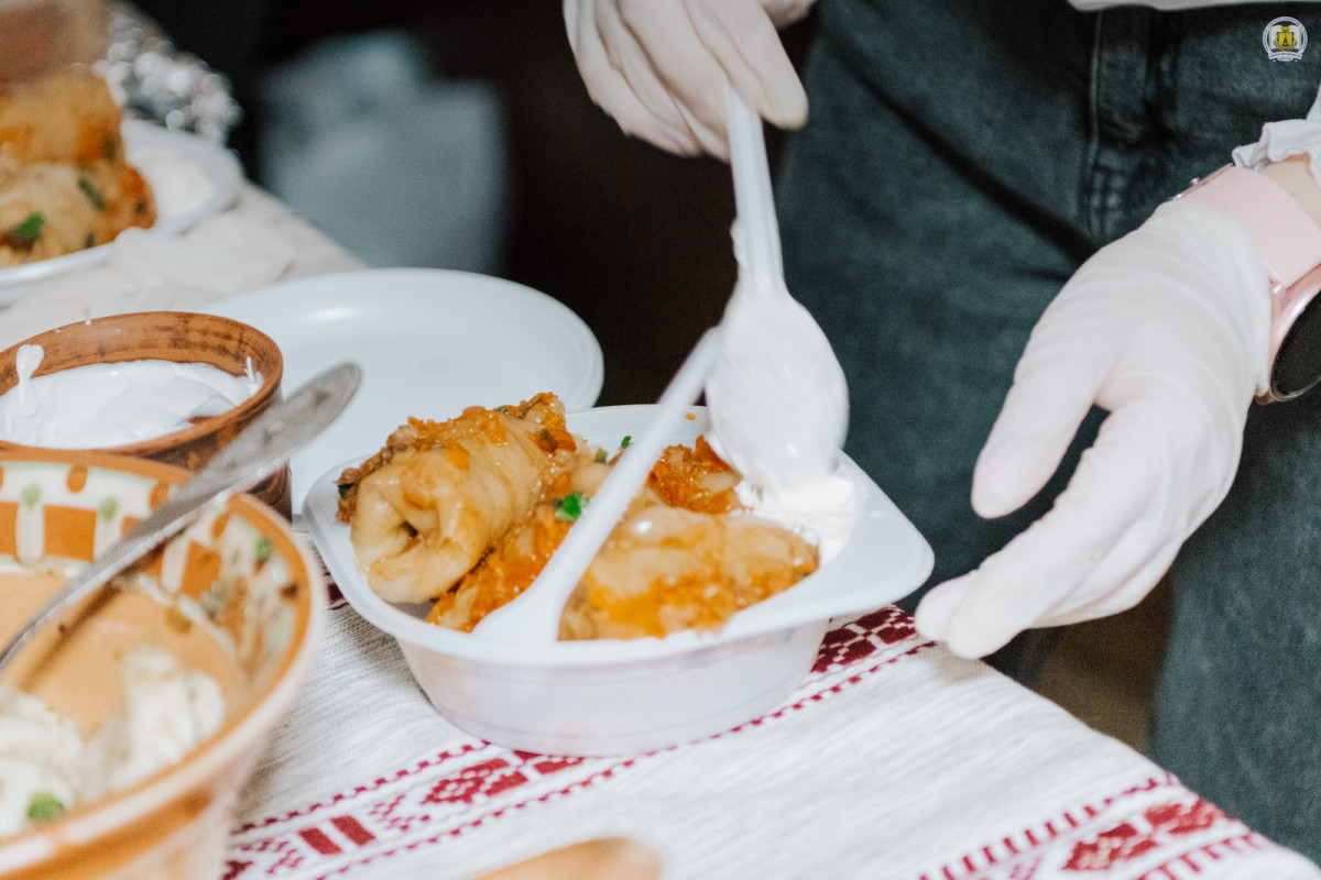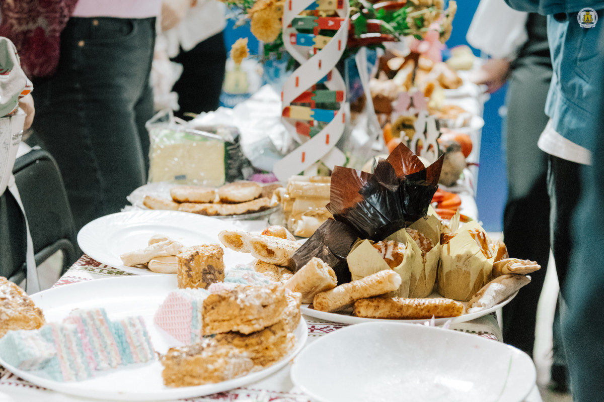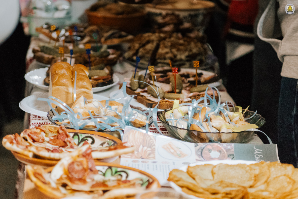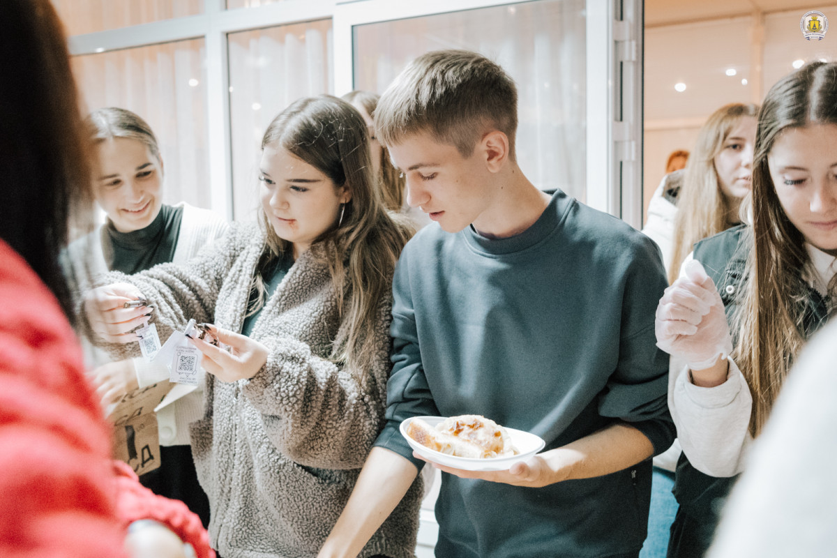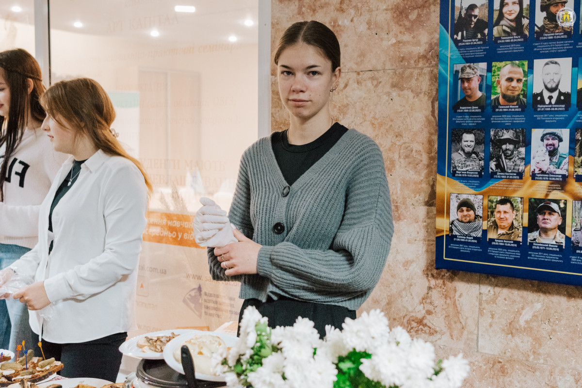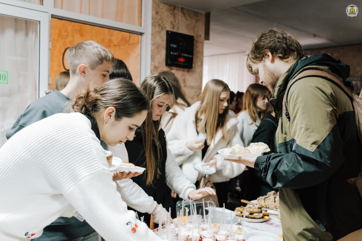 Близько опівдня, на великій перерві, на першому поверсі головного корпусу університету було направду велелюдно – тут набирала обертів виставка-ярмарок страв національної кухні. З-поміж страв якими могли почастуватися сковородинівці та гості були й смачні солоні та солодкі вареники й млинці, запашні канапки й пироги з різною начинкою, домашні ковбаски, наваристий борщ, соковиті голубці та ще багато різноманітних наїдків. Безумовно, кожен з факультетів та його представників заздалегідь продумував, який асортимент товару запропонує до продажу, як оформить своє торгове місце, як буде закликати потенційних покупців аби акумулювати якнайбільше коштів захисникам.