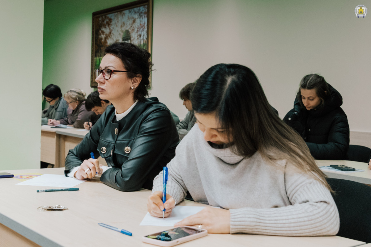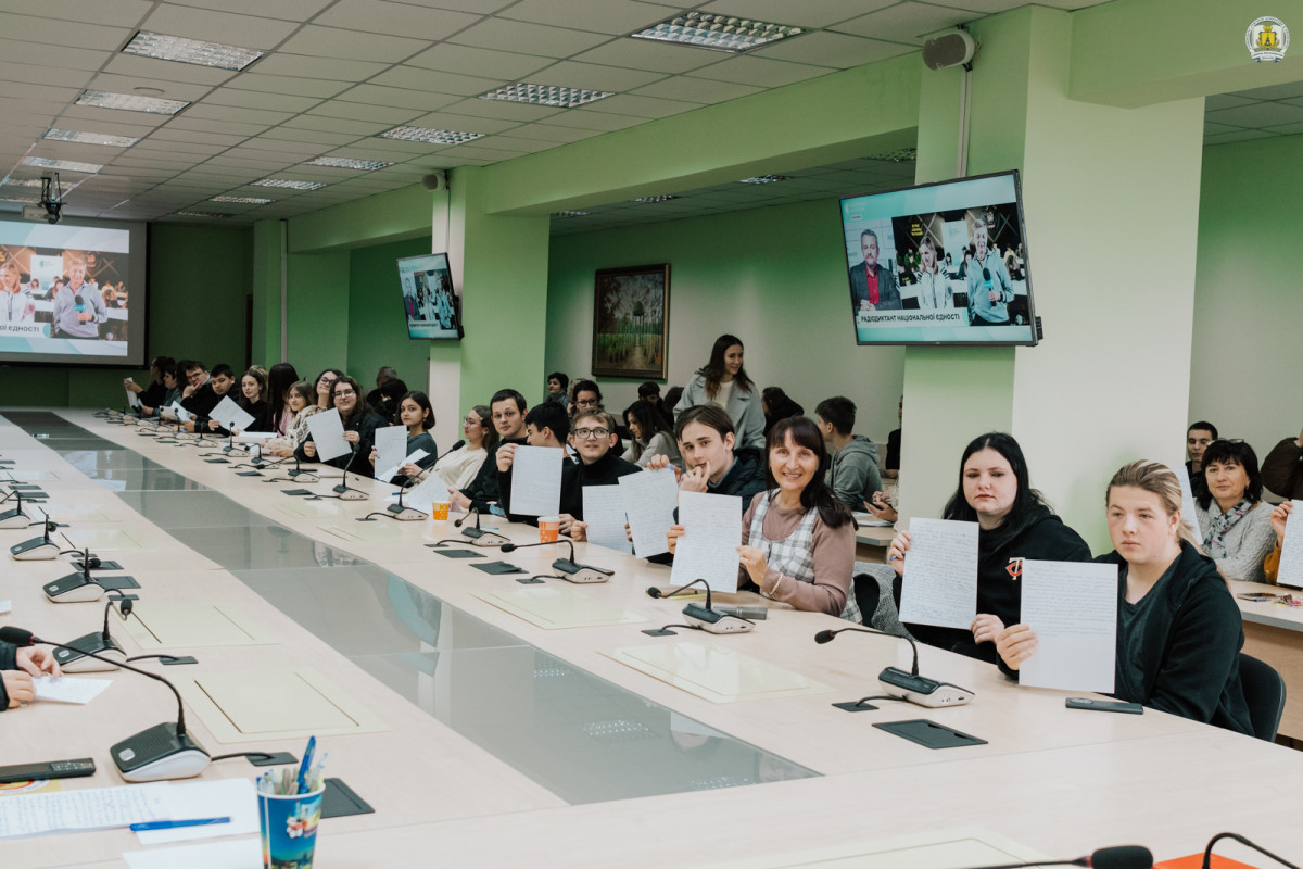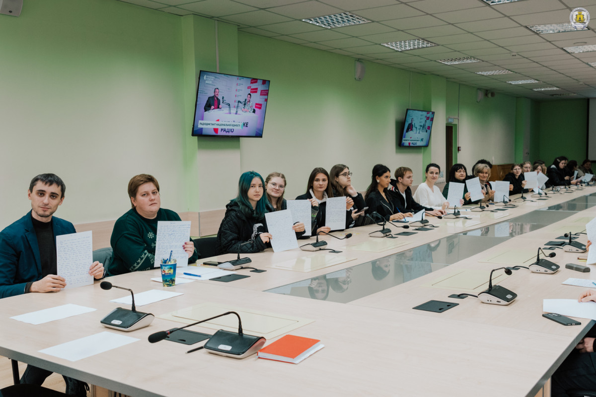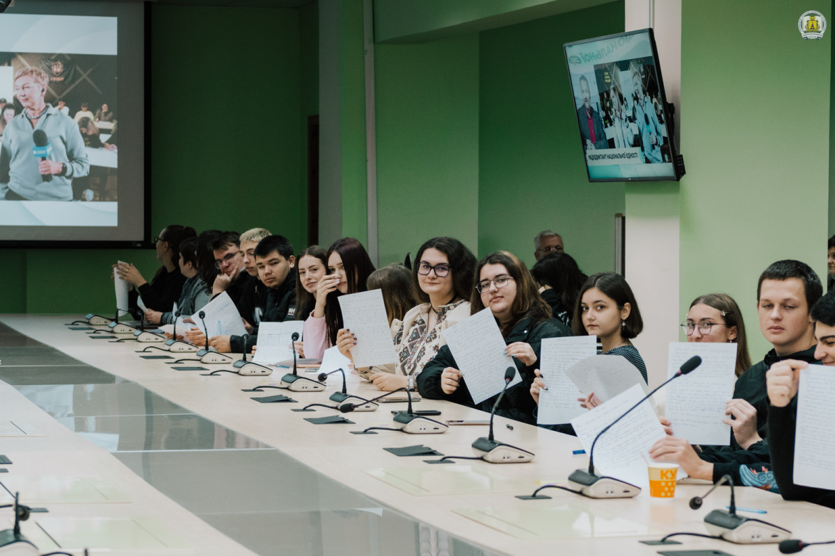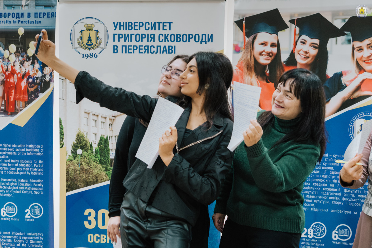Пресслужба університету також завітала до конференц-зали імені Василя Сухомлинського Університету Григорія Сковороди, де зібралися близько сотні викладачів, здобувачів освіти та співробітників, аби спільно долучитися до написання тексту-2025 під назвою «Треба жити».