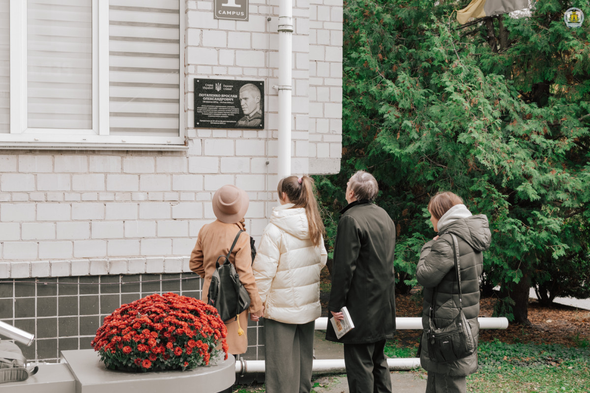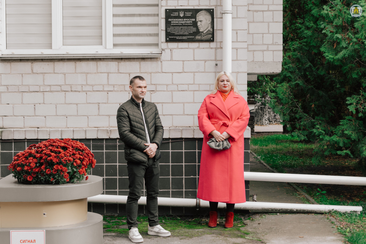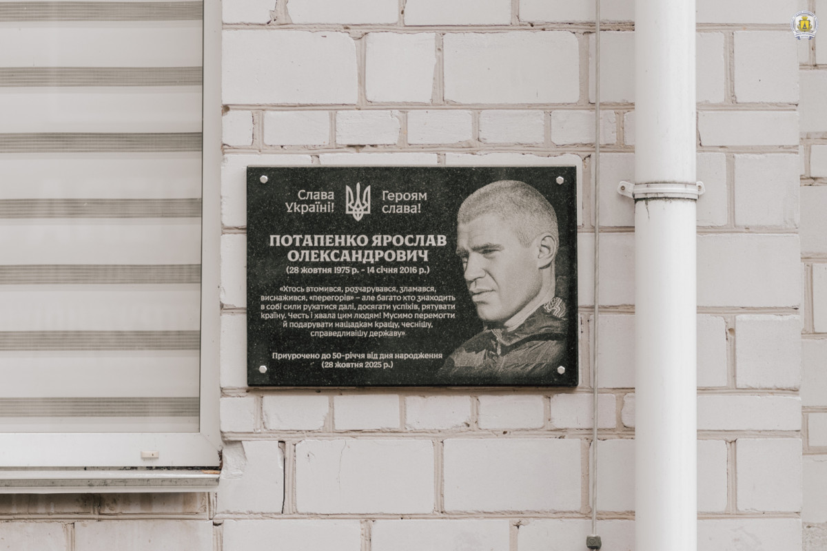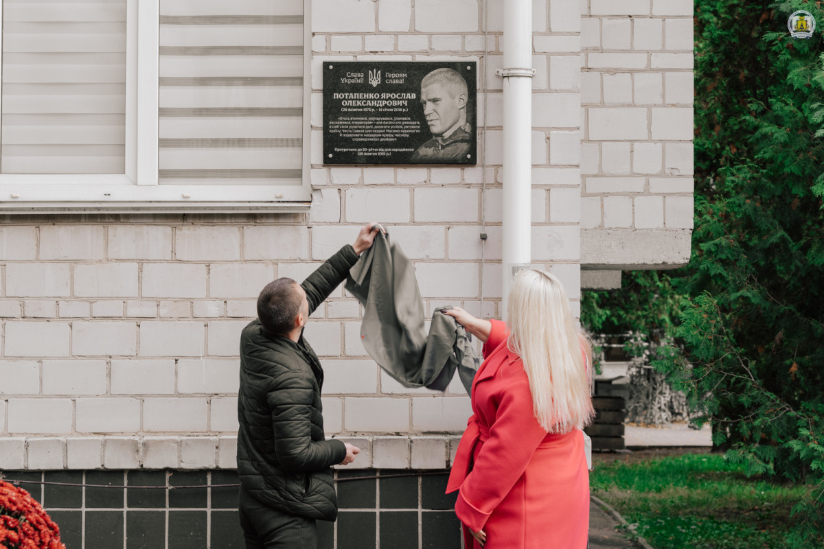 За мить ректор Віталій Коцур та дружина Руслана Потапенко зняли завісу з меморіальної дошки і на усіх присутніх поглянув портрет Ярослав Олександровича майданівських часів з викарбуваними датами життя та смерті і його відомою і донині актуальною цитатою «Хтось втомився, розчарувався, зламався, виснажився, «перегорів» – але багато хто знаходить в собі сили рухатися далі, досягати успіхів, рятувати країну. Честь і хвала цим людям! Мусимо перемогти й подарувати нащадкам кращу, чеснішу, справедливішу державу».