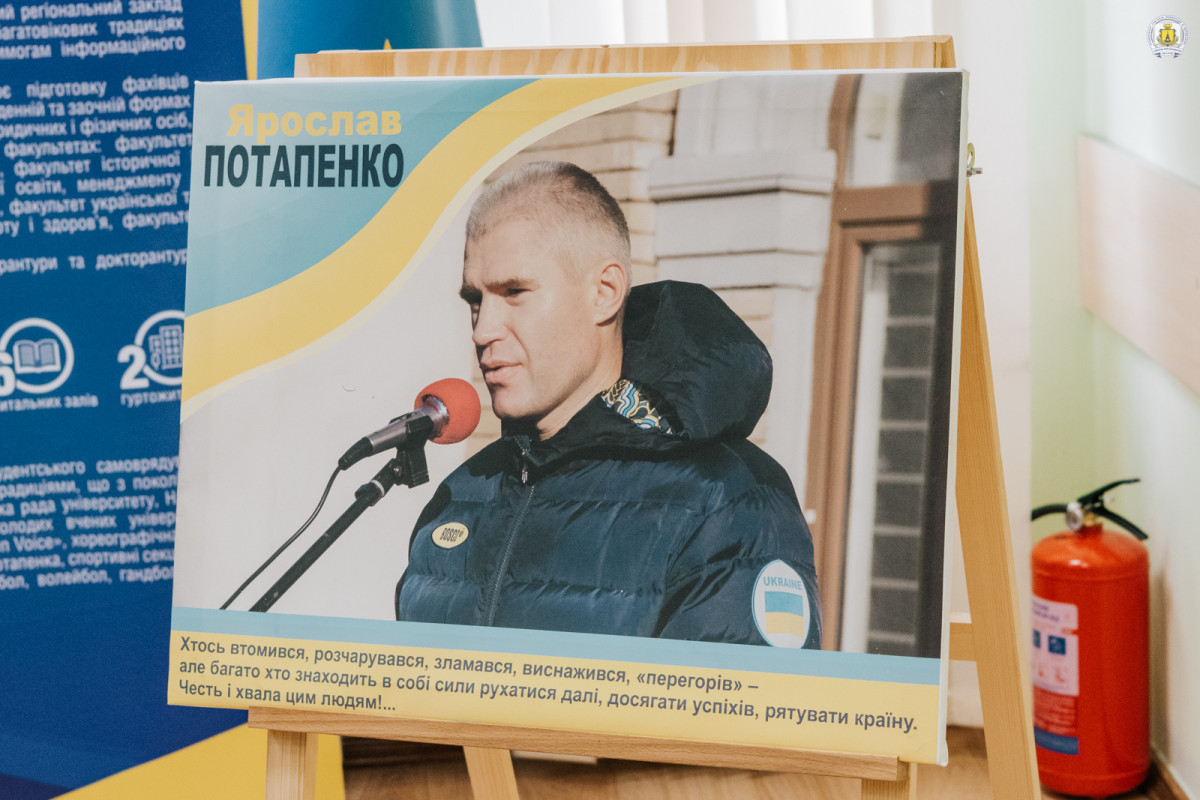 «Кожен день віддаляє буремні події 2013-2014 рр., які журналісти й політологи назвали «зимою, що нас змінила» – та ця дефініція надзвичайно вузька: після тієї зими Україна вже не була такою як раніше. Такі люди, як Ярослав Потапенко, як наш ректор Віталій Коцур, як десятки викладачів і студентів, чітко усвідомили: банда Януковича зі своїми кремлівськими кураторами хоче примусити нас іти сценарієм Білорусі, остаточно зробити колонією росії. З того часу минуло багато років. Ми в горнилі кривавої війни, платимо найвищу ціну за свободу й незалежність. Але не можемо забувати тих, хто тоді повстав і не дав країні зійти з європейського, демократичного шляху», – зазначив модератор заходу, провідний фахівець відділу інформаційних технологій та зв’язків з громадськістю Олександр Молоткін.