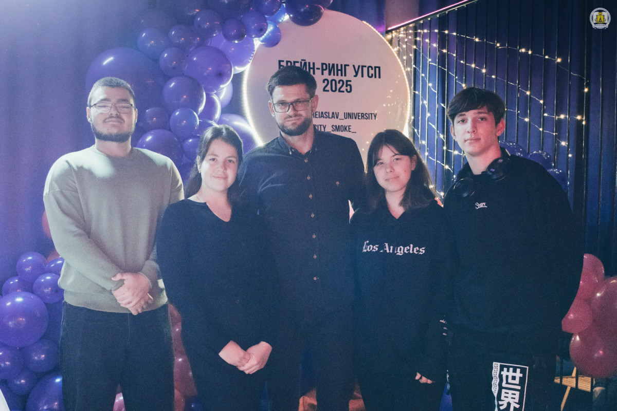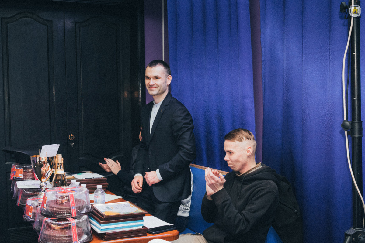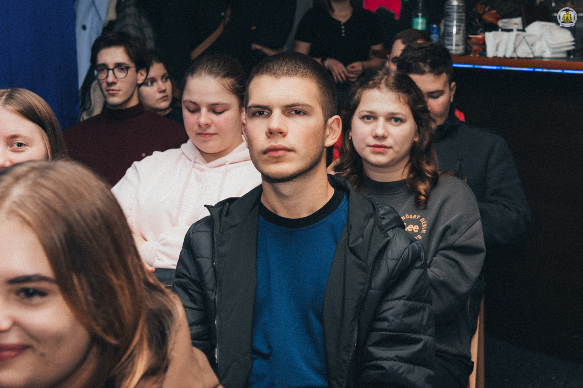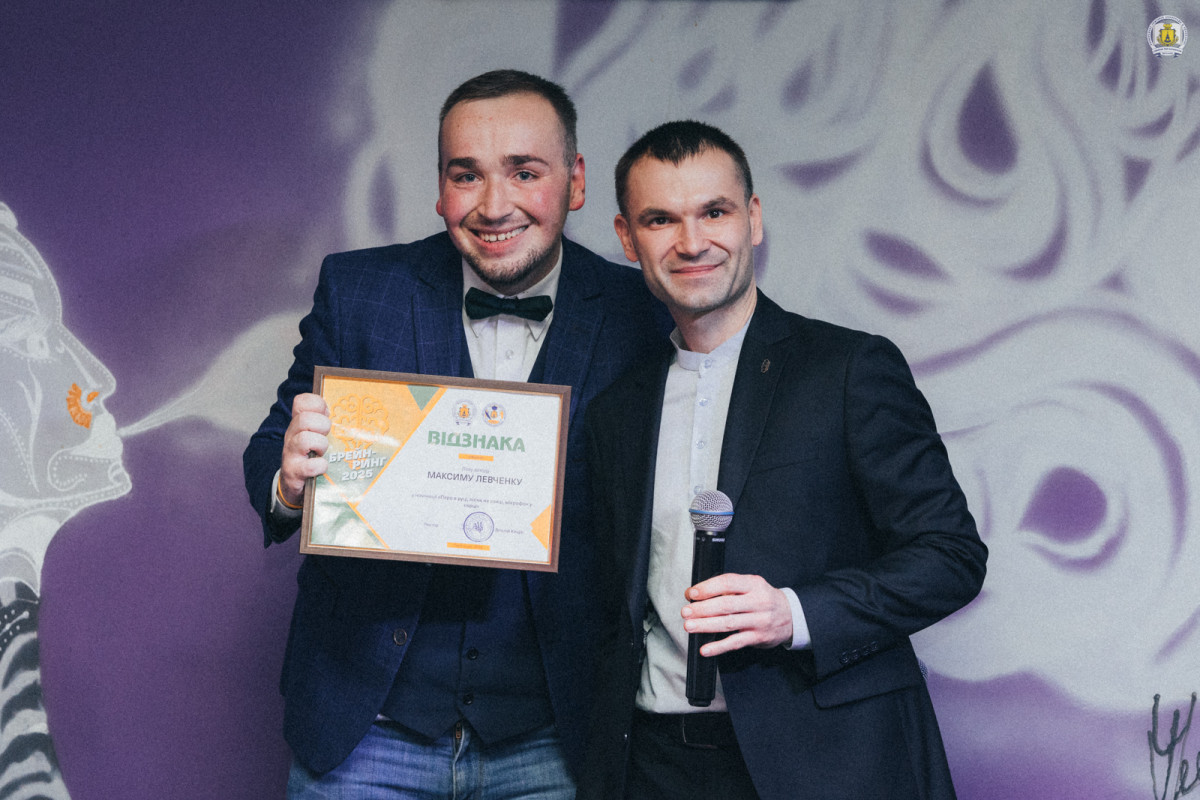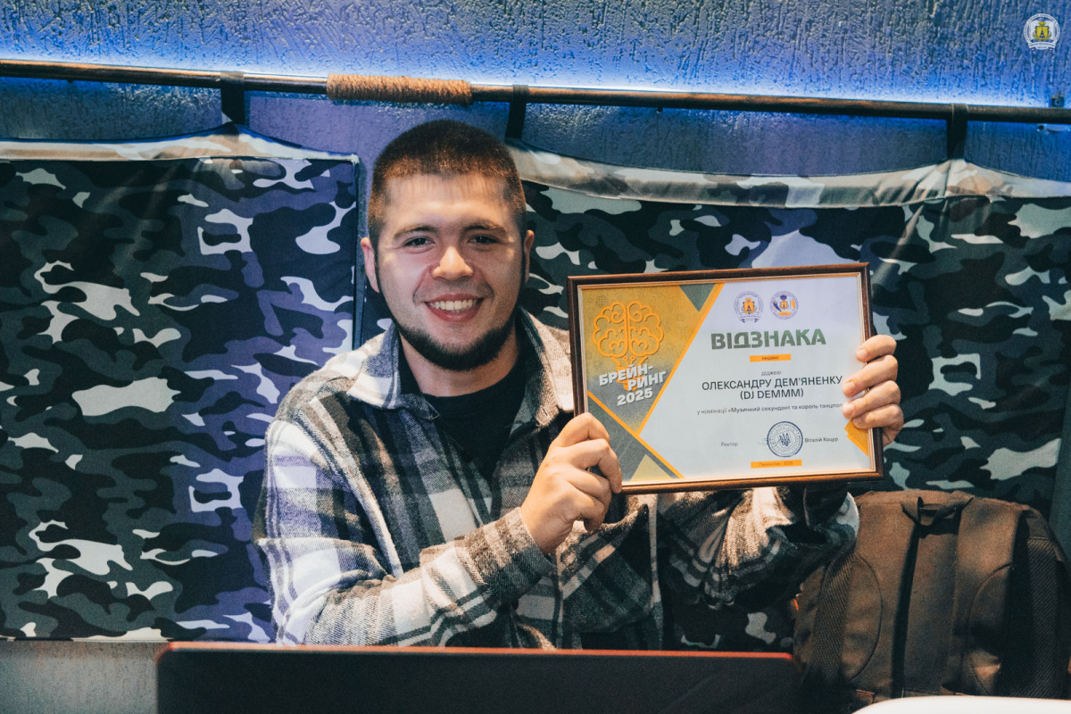 Поки організатори готувалися до церемонії нагородження, ведучий розповів про те, що у цей вечір організатори мали намір зібрати на одному майданчику не лише топ-інтелектуалів УГСП, а й зірок переяславського шоу-бізнесу – тих, хто пише і випускає на стрімінгові платформи власні пісні, знімає кліпи на них. На прикрість, левовій частці з запрошених, зважаючи на поважні причини і обставини, «засяяти» на «Брейн-Рингу» не вдалося – їх неодмінно запросять на майбутні заходи. Але один з тих, хто, свого часу, у студентські роки, «сяяв» на сковородинівській сцені, а нині повернувся до альма-матер не лише як методист Навчально-наукового центру забезпечення якості освіти університету, а й новоявлена зірка для вже нового покоління сковородинівців таки знайшов час завітати – мова про Бориса Любченка, який у цей вечір подарував присутнім свій авторський суперхіт «Солодкий мед». Ми помітили, що протягом сьогоднішнього дня її прослуховування на всіх майданчиках дещо зросли – після такого вибухового виступу інакше і не могло бути.