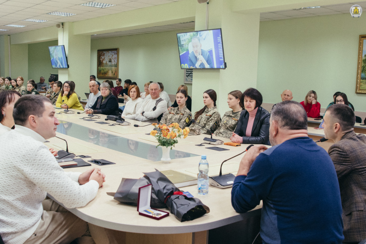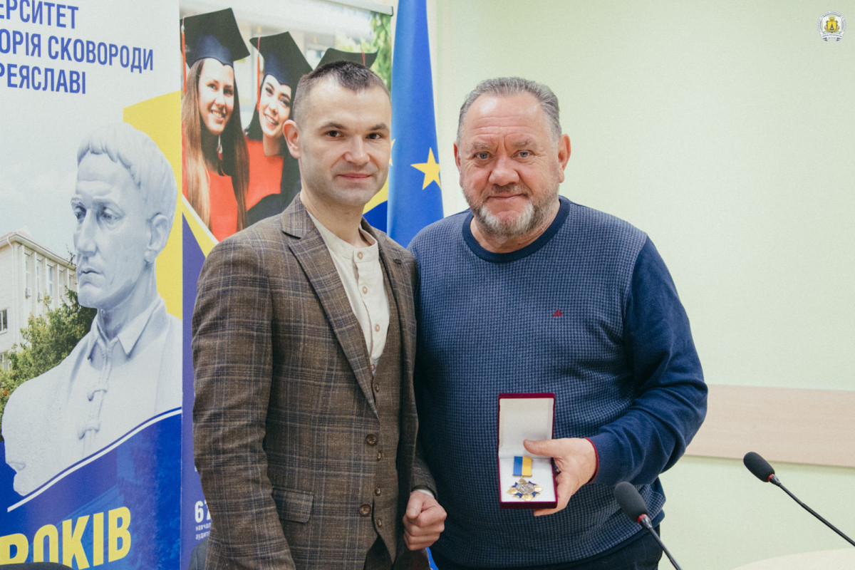 «У цей ранок ми раді вітати в стінах нашого університету Людину з великої літери, справжнього українця. Де б не був – він несе українську ідентичність. Я неодноразово бачив його під час своєї роботи у Верховній Раді України, і знаю як він ревно відстоював проукраїнську позицію – гадаю, це надихало й молодь, яка потім пішла на Революцію Гідності й відстоювати свою державу з початком війни. В Університеті Григорія Сковороди в Переяславі є почесні нагороди, які ми вручаємо достойним українцям. Олександр Юрійович обмовився про три сторінки регалій і згадок про нагороди – ми хотіли б почати четверту, і вручити Богдану Михайловичу університетську відзнаку «Орден Володимира Мономаха», який 20 років княжив у Переяславі», – підкреслює Віталій Вікторович та, під оплески присутніх, вручає відомому гостю цю нагороду. Разом з тим дарує плід праці кількох поколінь переяславських та українських сковородинознавців – колективну монографію «Вічно сучасний: життя, філософська, педагогічна та літературна творчість Григорія Сковороди». Наприкінці літа її презентували в Національному заповіднику «Софія Київська» під час гуманітарного форуму «Сковорода і свобода: внутрішня незалежність як основа державності», організованого Університетом Григорія Сковороди в Переяславі спільно з Благодійним фондом «МХП-Громаді».