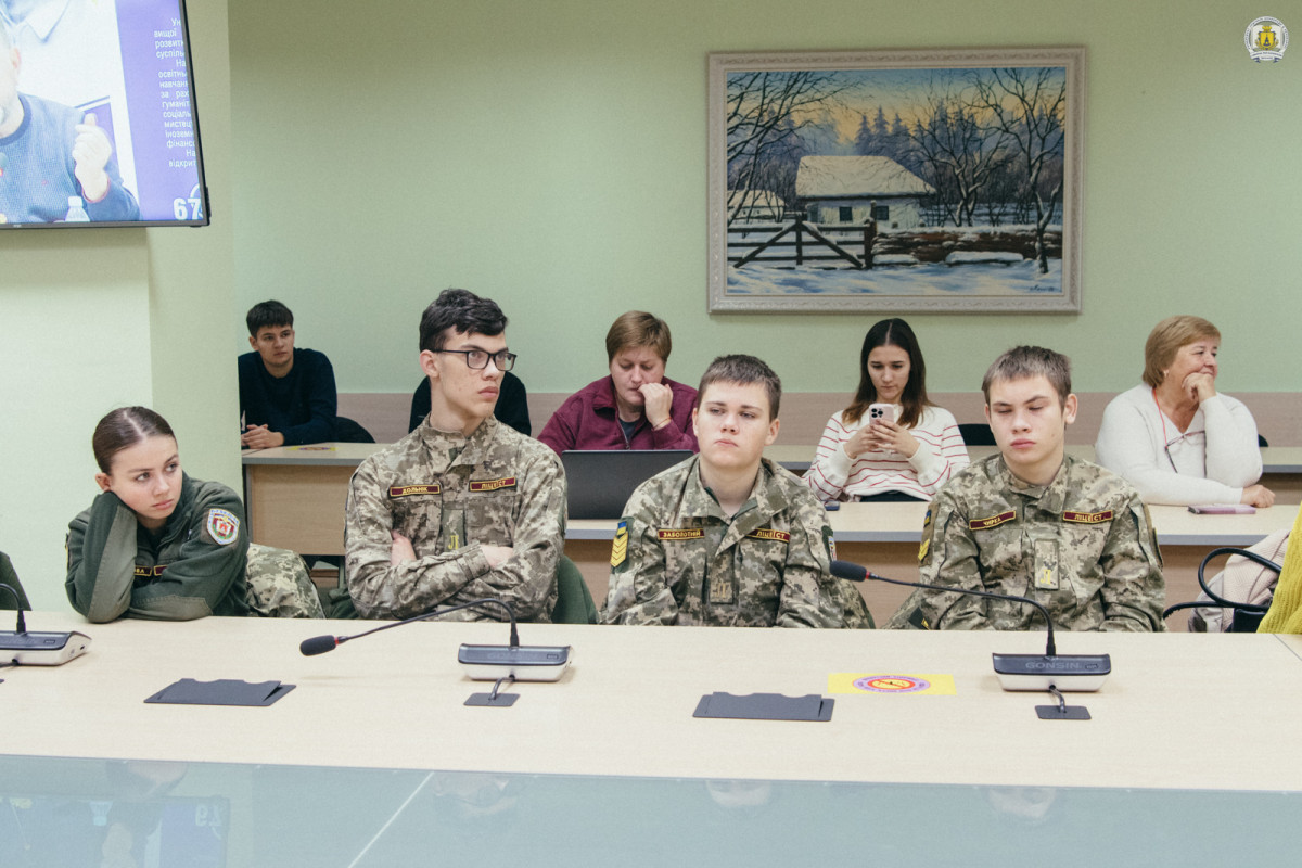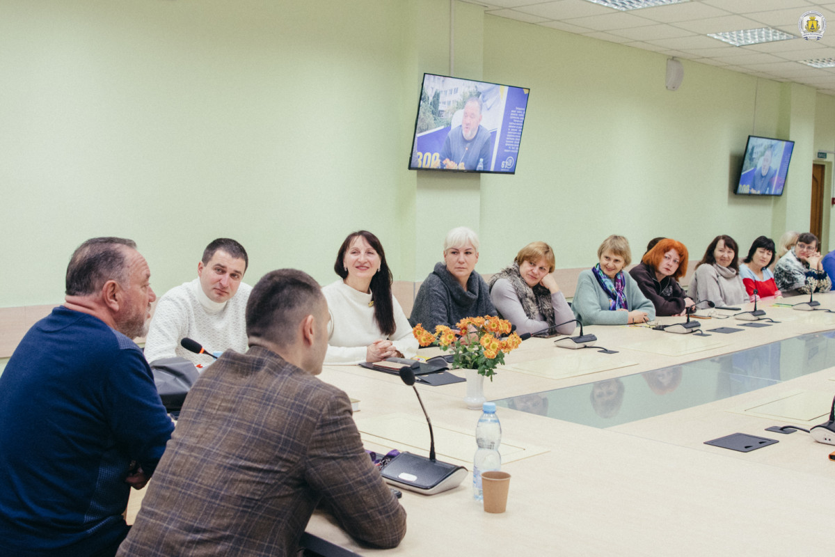 Надалі сідає за стіл і зізнається, що ця зустріч, попри чималу попередню їх кількість, є своєрідною прем’єрою у подібному форматі – з конференц-мікрофонами, екранами й колонками, за великим столом – «ніби на своєрідному з’їзді» (жартує).
