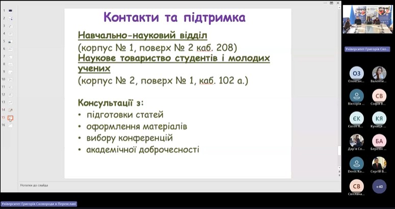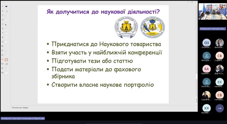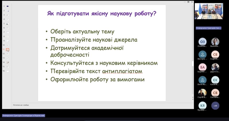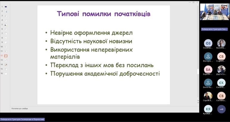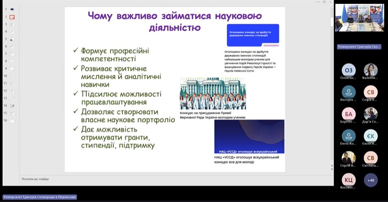 19 листопада 2025 року в Університеті Григорія Сковороди в Переяславі, у змішаному форматі – наживо та в онлайні на платформі «Microsoft Teams» відбулася змістовна зустріч здобувачів освіти, молодих учених в межах багаторічного курсу, що став традиційним івентом Наукового товариства університету, «Основи написання наукових досліджень».