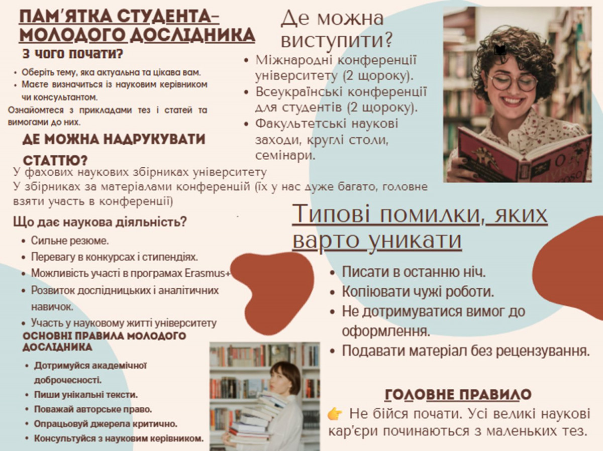 Ірина Степанівна окреслила основні напрями, у яких студенти можуть проявити себе: участь у міжуніверситетських та міжнародних конференціях, подання робіт до фахових збірників, участь у конкурсах наукових робіт, діяльність у студентських наукових гуртках. Принагідно промовиця повідомила про графік найближчих подій, до участі в яких здобувачі можуть долучитися вже цього навчального року, приміром XIX Міжнародної науково-практичної конференції молодих вчених, аспірантів та студентів «Основні напрями розвитку наукових досліджень молодих учених», яка відбудеться 27 листопада 2025 року.