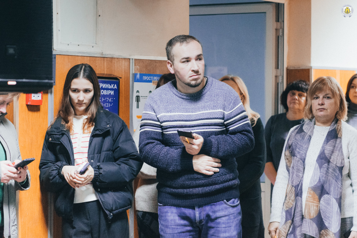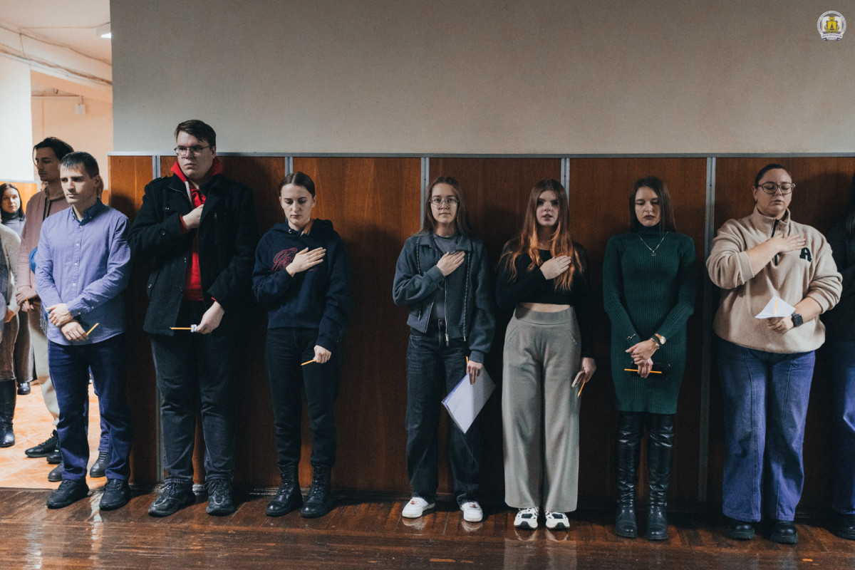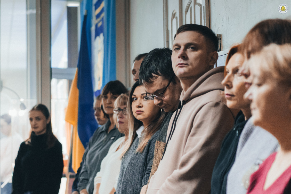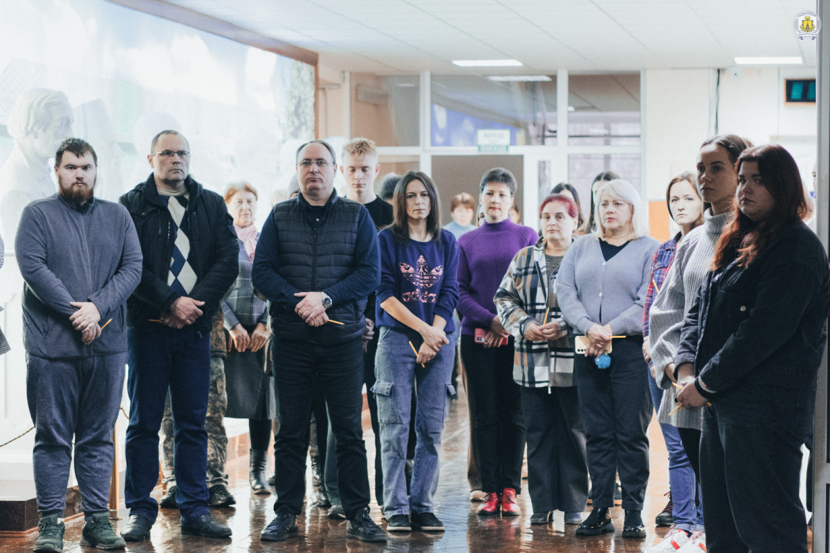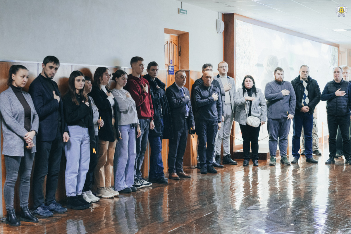 Незмінно у холі головного корпусу зібралися викладачі, співробітники, здобувачі та гості університету, щоб разом віддати шану подвигу та пам’яті наших героїв. Хвилиною мовчання вшанували тих, хто віддав своє життя за свободу і незалежність України, спільно виконали Державний Гімн України.