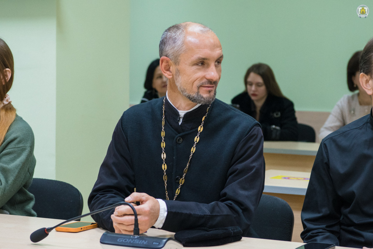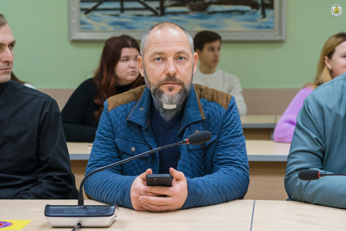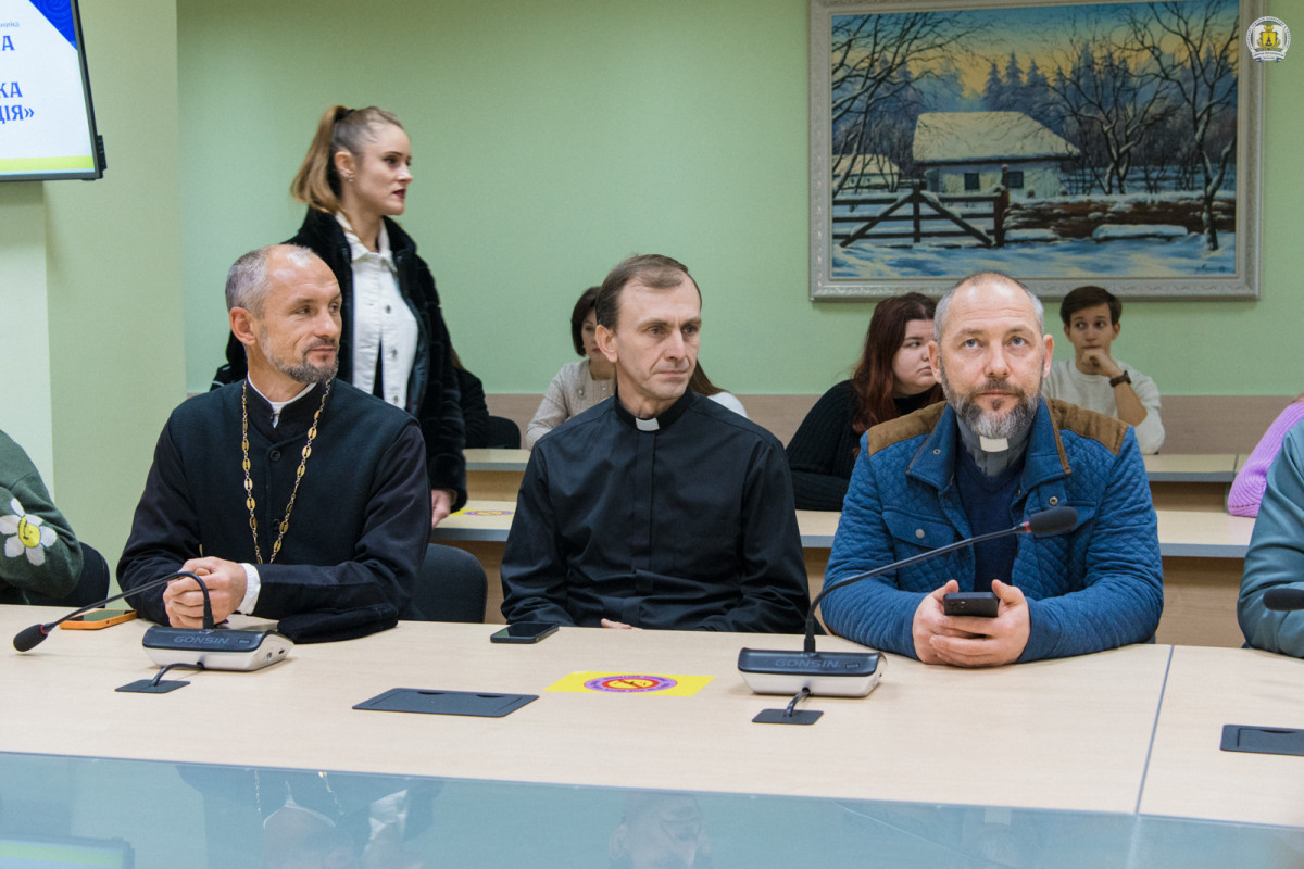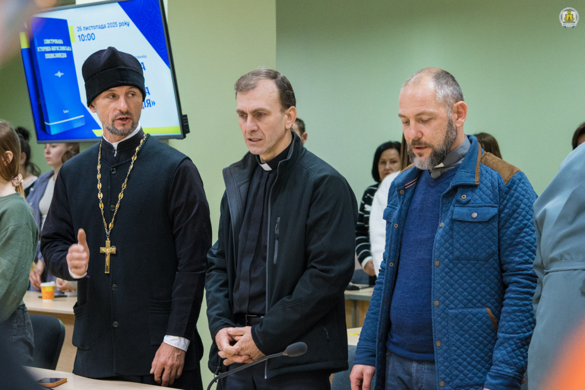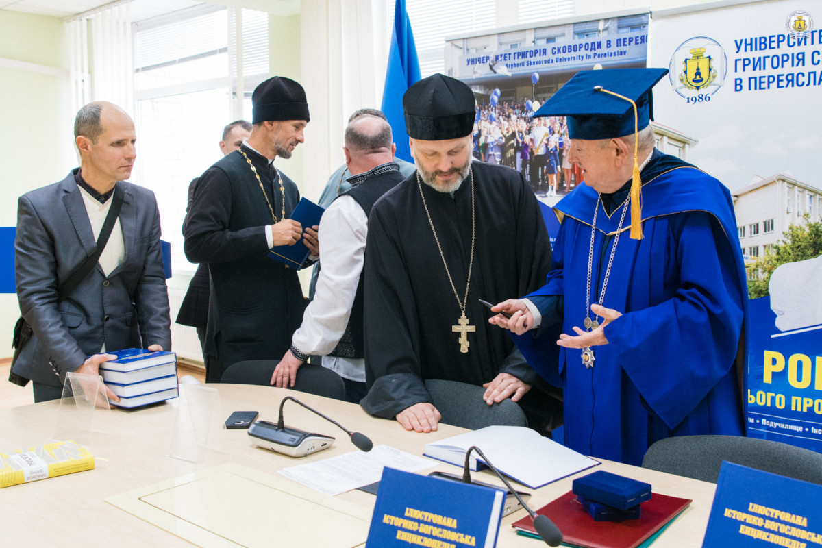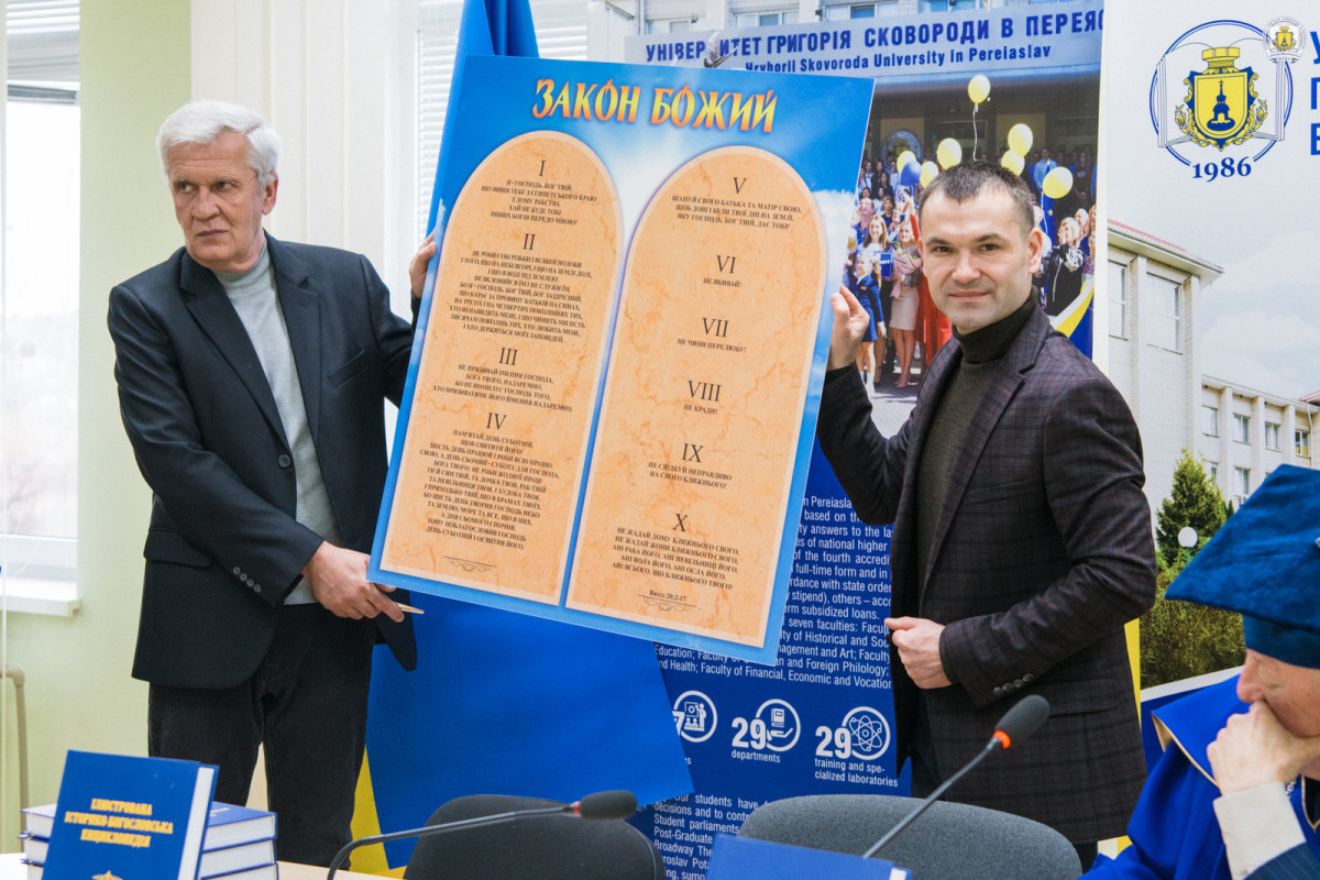 «Коли я вперше взяв до рук ці томи «Історико-богословської енциклопедії», зрозумів: це вже не просто книга, це джерело. Прочитав одну статтю – і захотілося читати далі. Кожне визначення, кожна концепція ґрунтовно обґрунтовані, виважені, корисні для всіх – і для православних, і для протестантів, і для греко-католиків, і для римо-католиків, і для освітян. Тому я вже поставив собі за пріоритет прочитати всі п’ять томів. Для нас, християн Переяславщини, ця книга – справжній дар. У нас діє Рада церков, до якої входять православні ПЦУ та протестантські громади. Ми різні за традиціями, але єдині в головному: у нас один Бог, одна Україна, одне місто, в якому ми живемо й служимо. І ця енциклопедія саме просвічує, дає свідомість, волю, вільнодумство, про яке тут говорили, і об’єднує нас у Христі. На жаль, ми бачимо, як навіть в одній православній традиції можливий розкол: Московський патріархат служить Москві, а ми – Україні. І між нами, на жаль, не просто відсутність єдності, а іноді й ворожнеча. Нехай ця книга стане тим світлом, яке допоможе нам бачити спільне, а не відмінне. Дуже приємно, що в цих стінах ми, церковники й освітяни, разом говоримо про Бога, про богослов’я, про те, що об’єднує й дає сили. Це надихає нас шукати спільне й працювати разом. Ця енциклопедія стане настільною книгою в наших храмах і молитовних домах. Нехай Господь благословить вашу працю й надалі! Ви самі казали: Божа рука веде. Тож нехай ця рука й далі провадить вас до нових книг, нових томів, нового світла», – зазначив отець Іван та разом з іншими присутніми отцями, від імені Ради церков Переяславщини подарував університету символічний, але дуже важливий подарунок – Десять заповідей Божих у вигляді скрижалів, які можна розгорнути й пов’язати стрічкою.