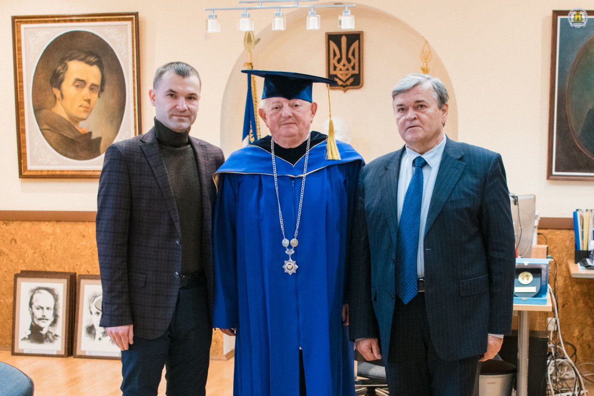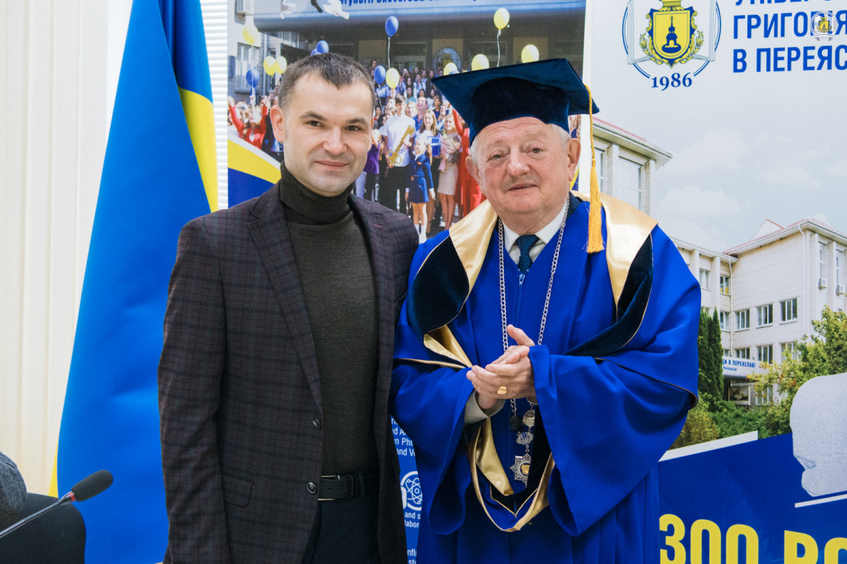 Зважаючи на те, що днями доктору історичних наук, професору, члену-кореспонденту НАПН України Василю Балуху виповнилося 70 років, на його вітальну адресу надійшли найтепліші сповнені глибокої поваги привітання від Університету Григорія Сковороди в Переяславі за підписом Віталія Коцура та Ніжинського державного педагогічного університету імені Миколи Гоголя за підписом ректора Олександра Самойленка. У знак шани від сковородинівців, а також Асоціації містоутворюючих закладів університетів, під оплески присутніх Василя Олексійовича було нагороджено оновленою відзнакою «Почесний професор» (у 2018 році Василю Балуху було присвоєно почесне звання «Почесного професора» ДВНЗ «Переяслав-Хмельницький ДПУ імені Григорія Сковороди» – прим.авт.), а також мантією, конфередераткою та іншими символами поважного академіка і науковця. Сповідуючи славетні сковородинівські традиції, саме Василю Олексійовичу випало стати науковцем, який першим отримав це почесне звання після перейменування закладу і оновлення нагороди.