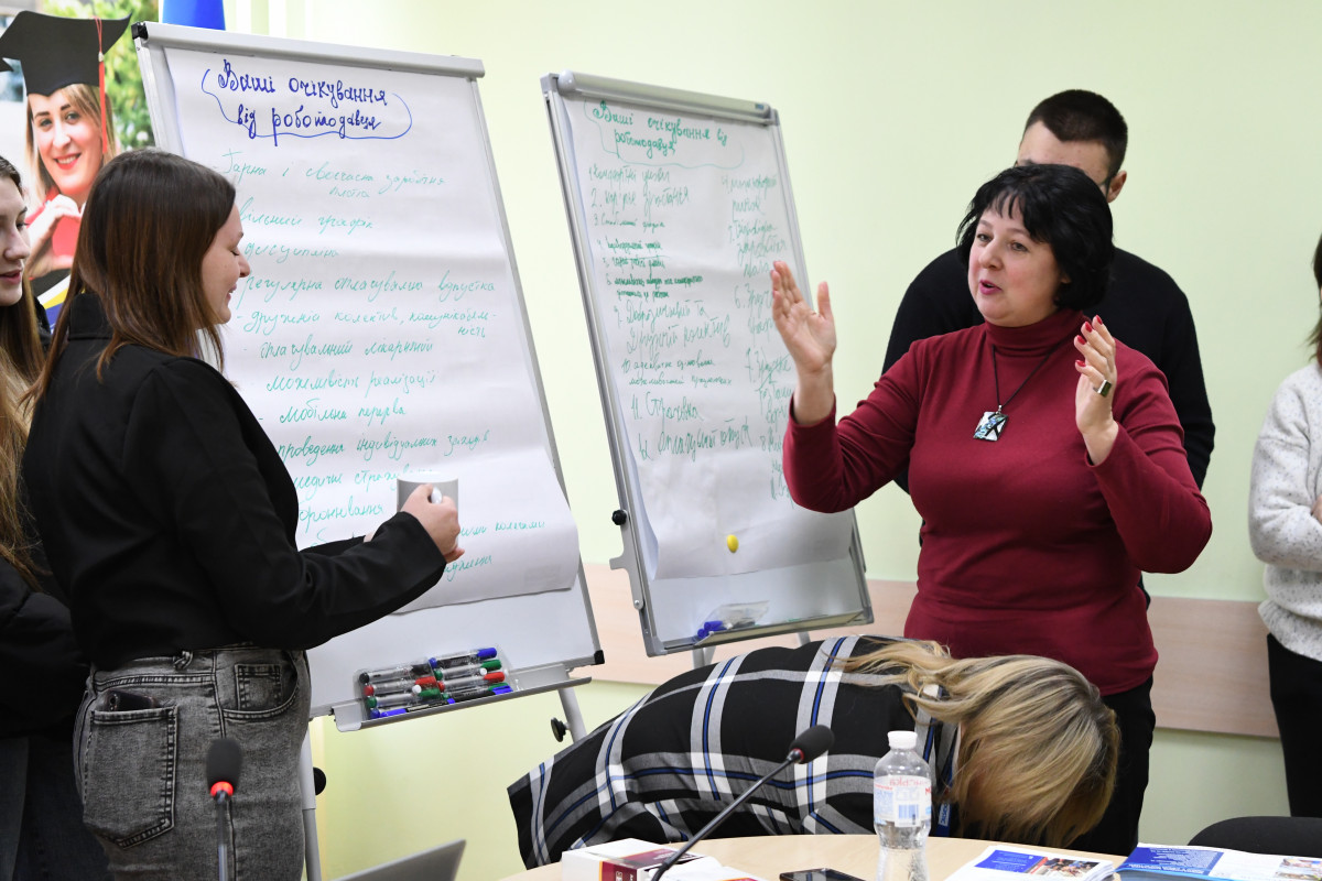 Ольга Стельмах, фахівчиня відділу персоналу, приділила увагу практичним аспектам підготовки до працевлаштування: складанню резюме, супровідного листа, формуванню професійного іміджу на співбесіді. Вона демонструвала приклади з реальної роботи компанії та підкреслила важливість уваги до деталей.