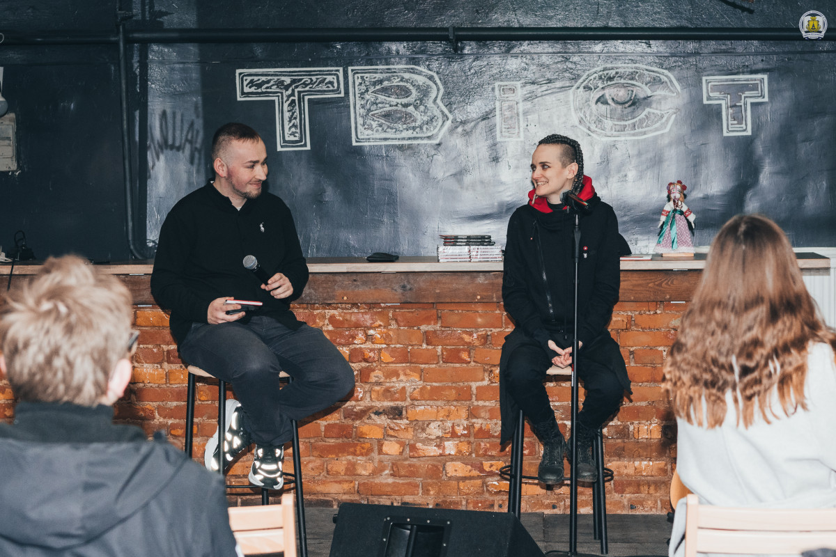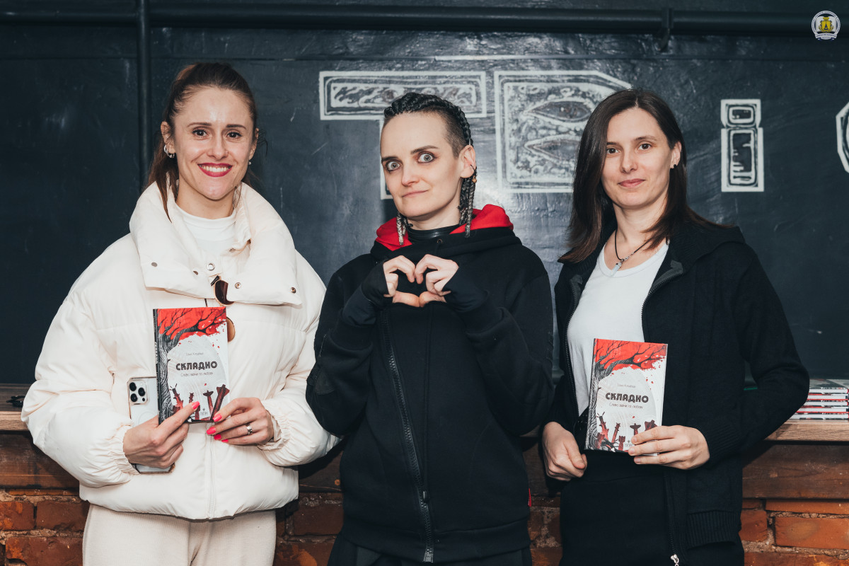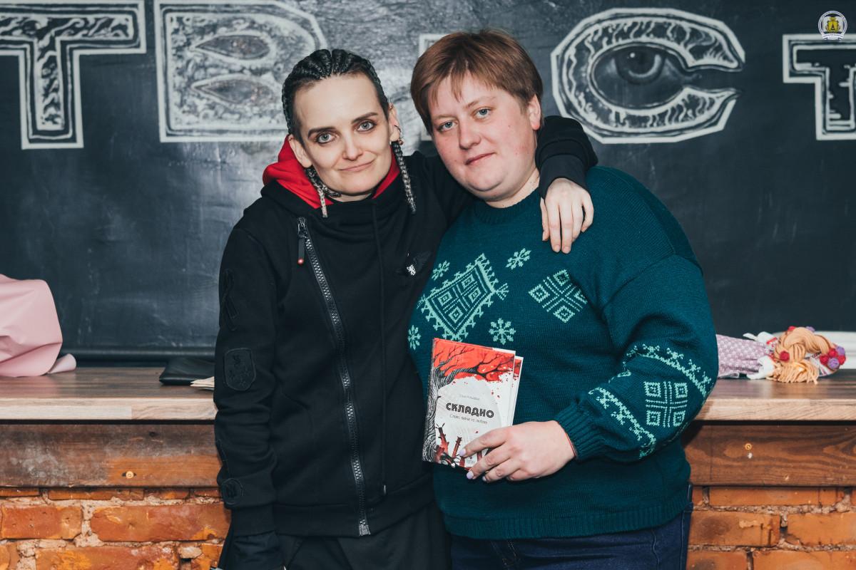 Важливою частиною вечора стала презентація збірки «Складно. Слова війни та любові», виданої у 2025 році. Саша розповіла, що раніше мала російськомовні збірки, але після Революції Гідності її внутрішній компас змістився. Вона розповіла, що видавництво «Маґура» самостійно знайшло її тексти у Facebook і запропонувало видати книгу, яка стала свідченням болю перших місяців повномасштабного вторгнення.