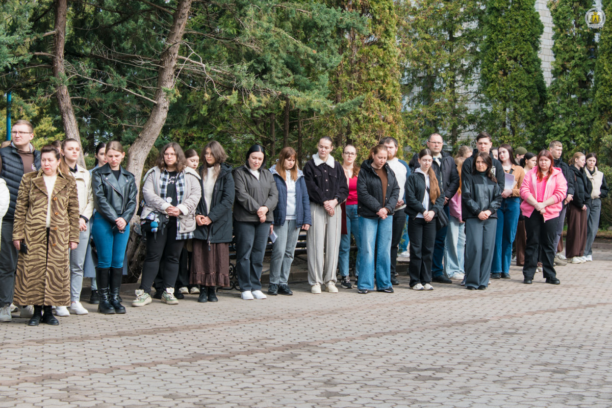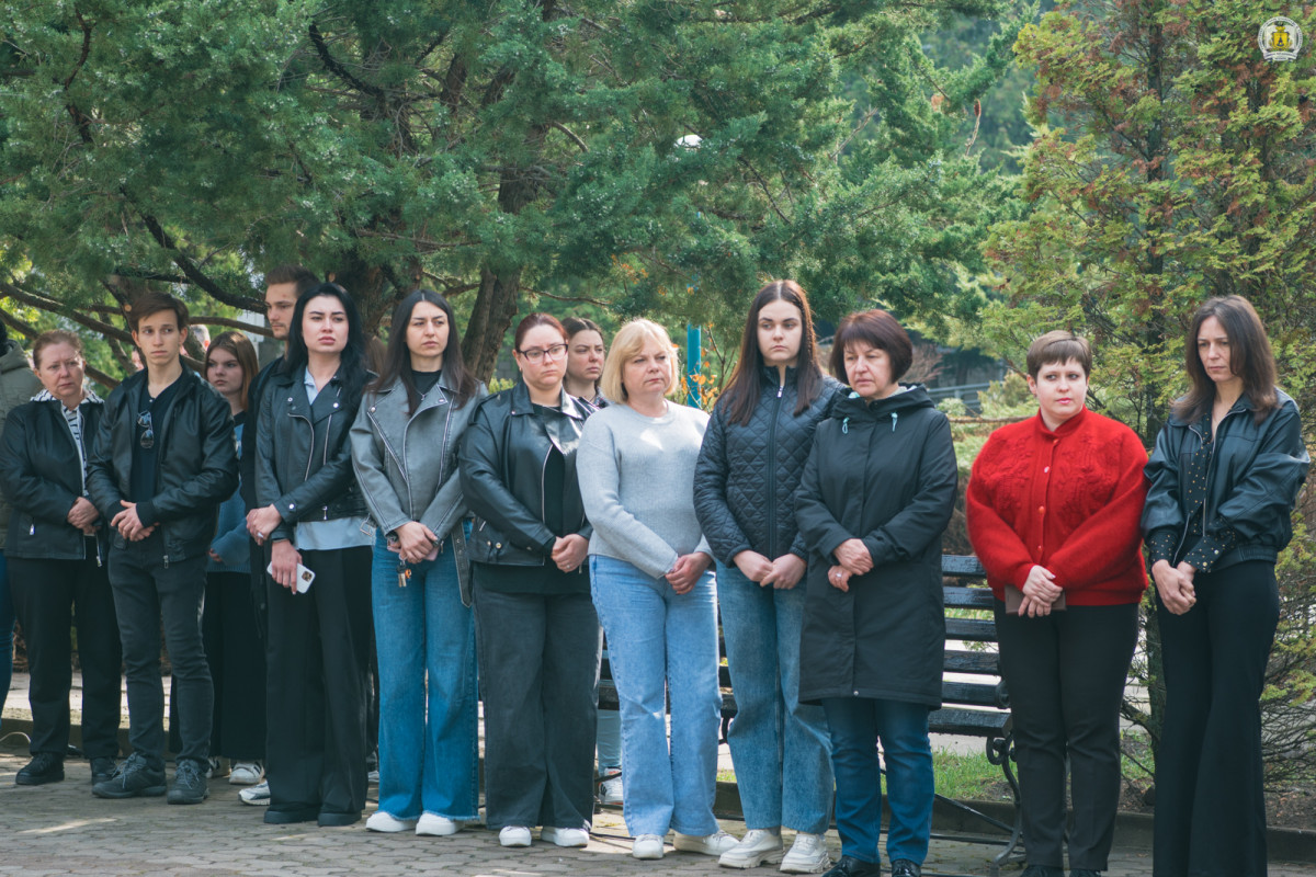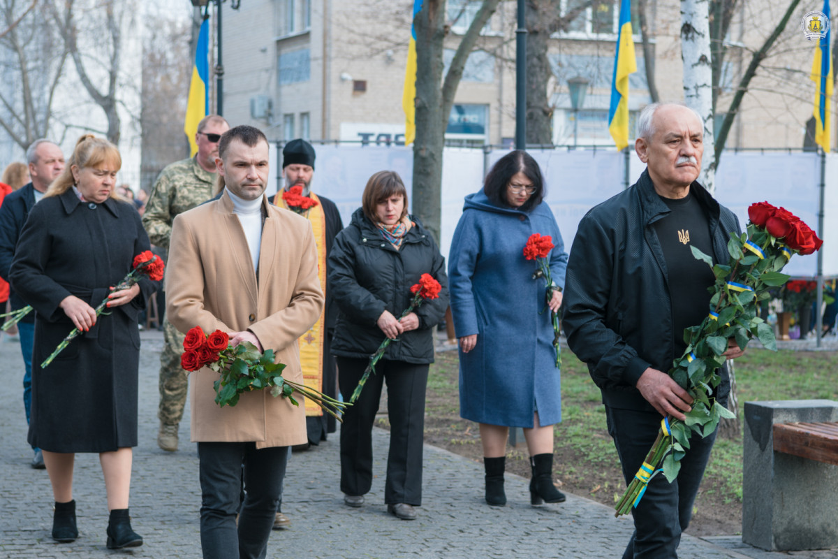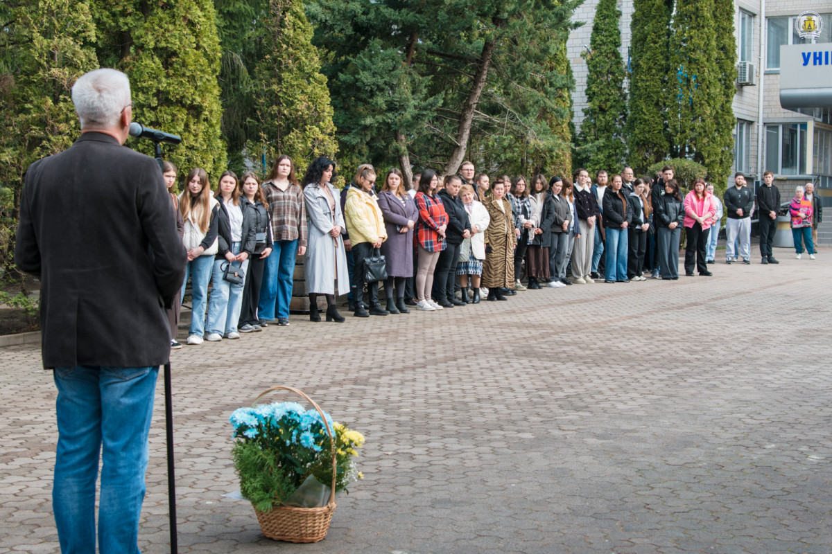 Рівно о 10:00 пам’ятні заходи продовжилися вже безпосередньо на території університету – біля погруддя Григорія Сковороди на центральній алеї. Тут зібралося близько сотні людей: викладачі, співробітники та студенти, які об’єдналися у спогадах та пам’яті про ті дні і ночі, живим очевидцем яких випало стати чи не кожному і кожній з присутніх.