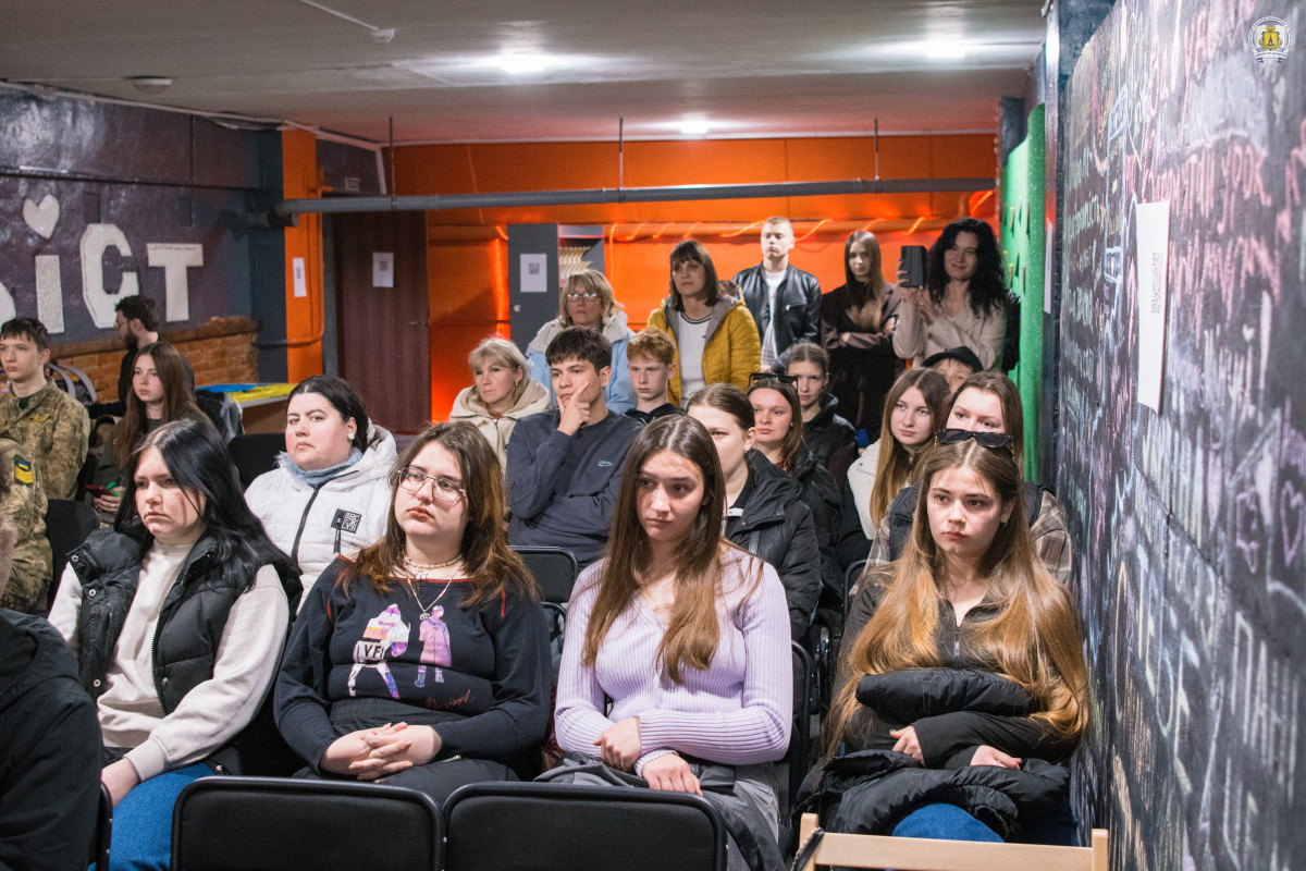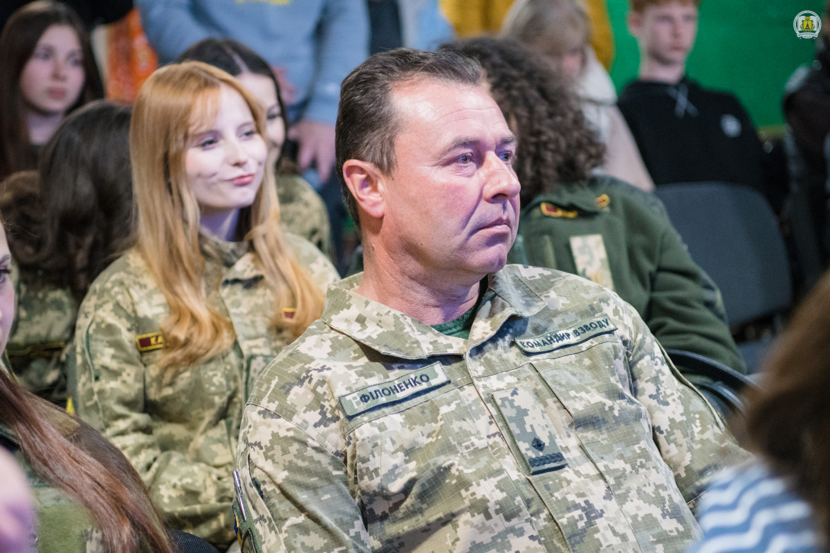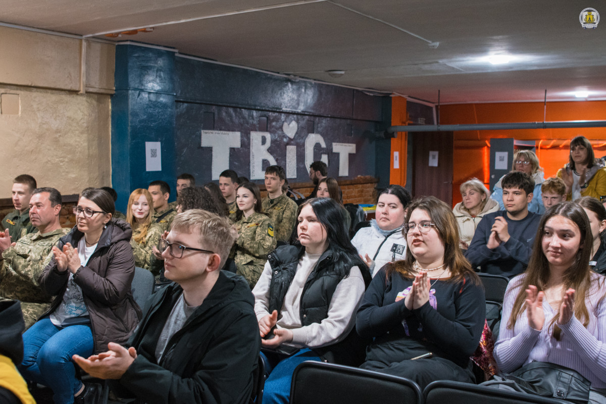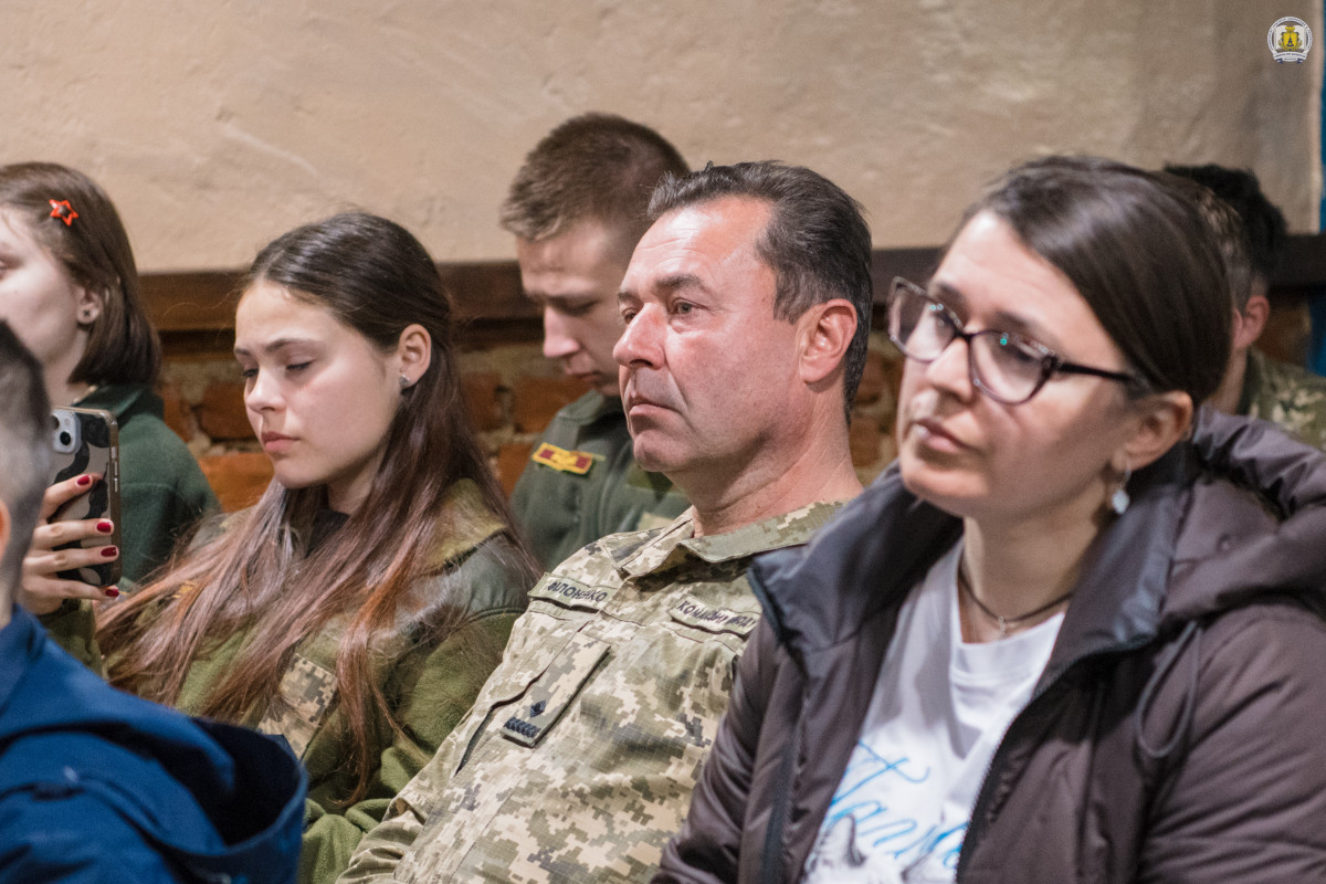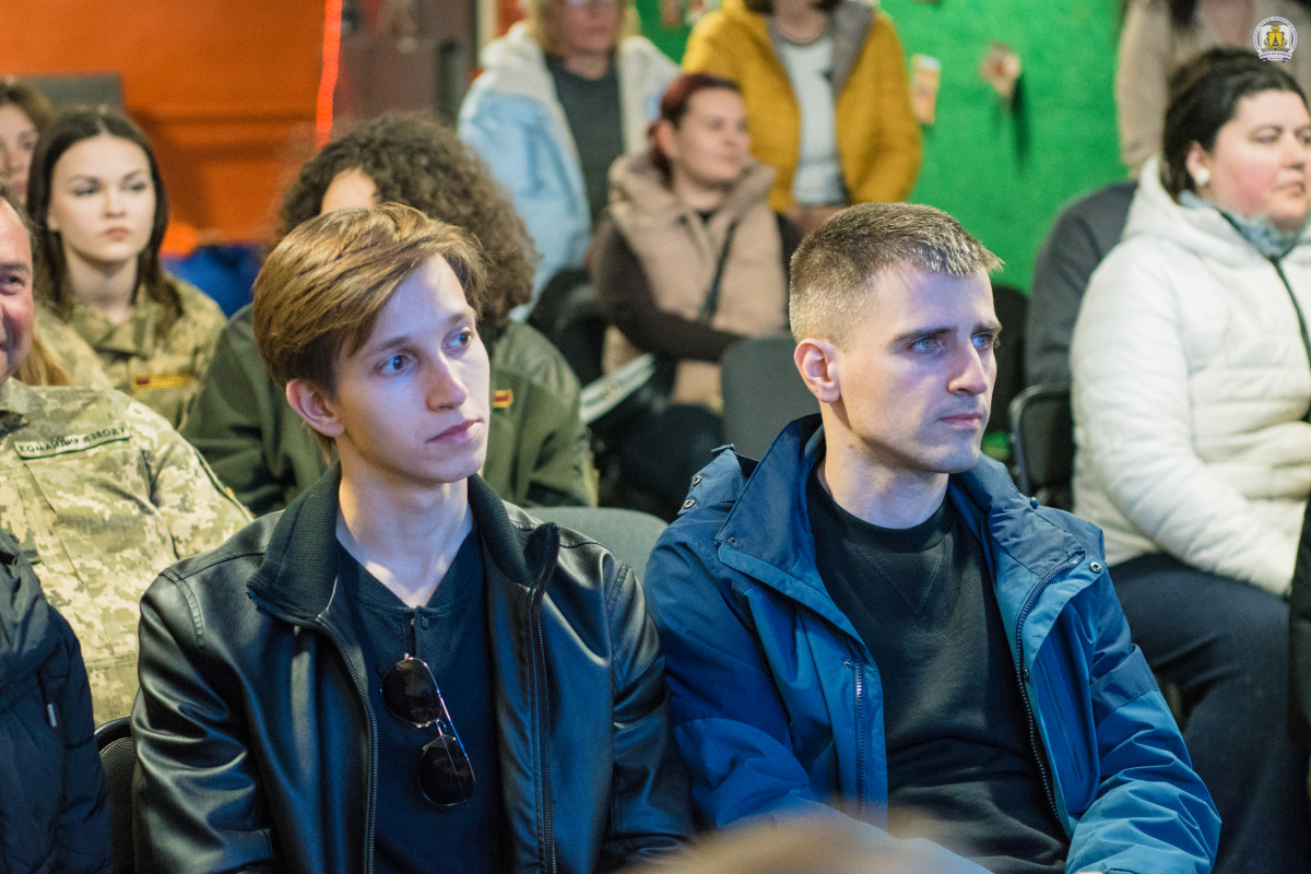 «Ви як молоді люди, які починають життя, маєте розуміти: що б ви не робили, вас завжди будуть критикувати. Хто хоч щось робить, його завжди сварять, а хто нічого не робить – той завжди хороший», – зазначив музикант та детально розповів про роботу «Культурних сил» – підрозділу, який проводить культурно-просвітницьку роботу безпосередньо в зоні бойових дій. Географія їхньої праці вражає: від Покровська до Лимана, Куп’янська, Костянтинівки та Бахмута. Кириченко представив свою мистецьку команду, згадавши побратимів: бандуриста Володимира Вікарчука («Шпилясті кобзарі»), зв’язківця Миколу Короля, піаніста Миколу Білика, якого в підрозділі жартома називають «позашлюбним онуком Ірини Білик», та командира Дмитра Мельника з гурту «Ot Vinta».