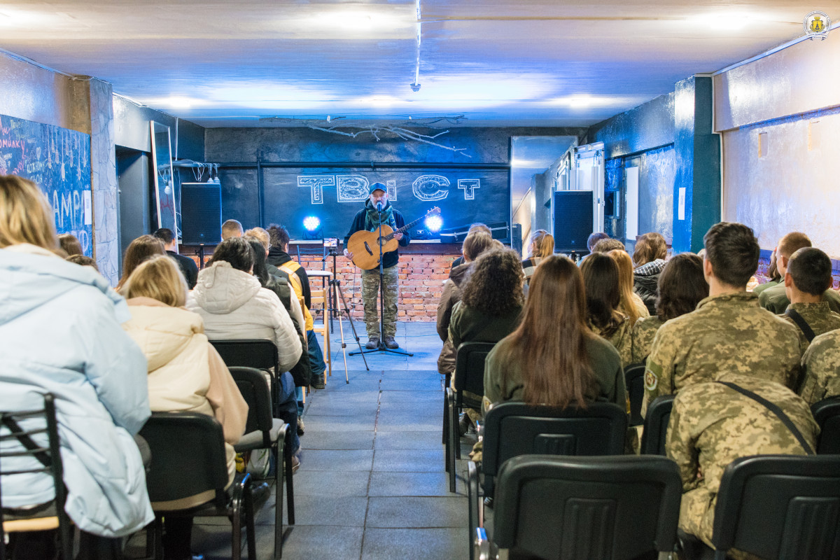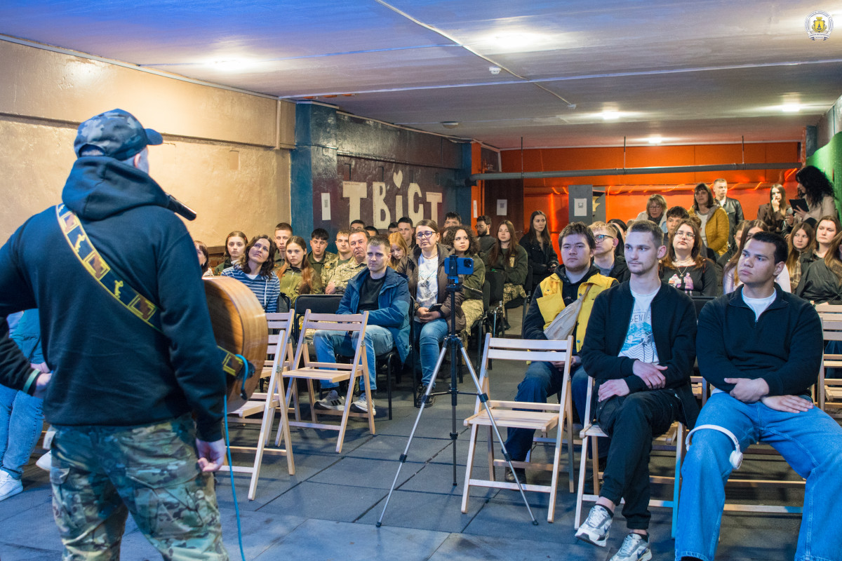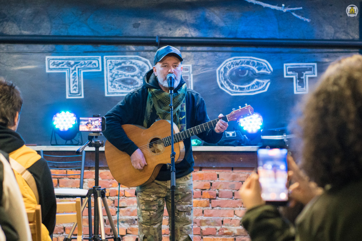 Між піснями, зокрема «Тероборона країни», «Трилер», «Сніг», «Я йду по воді», «Будьмо» та «Запах свободи» (написаної разом із Русланом Горовим) Віталій читав вірші побратимів та ділився спогадами про службу з Тарасом Тополею та Сергієм Василюком (які у різні роки теж були гостями нашого університету – прим.авт.), наголошуючи на силі «піксельного братства», де люди з різних світів стають однією родиною.