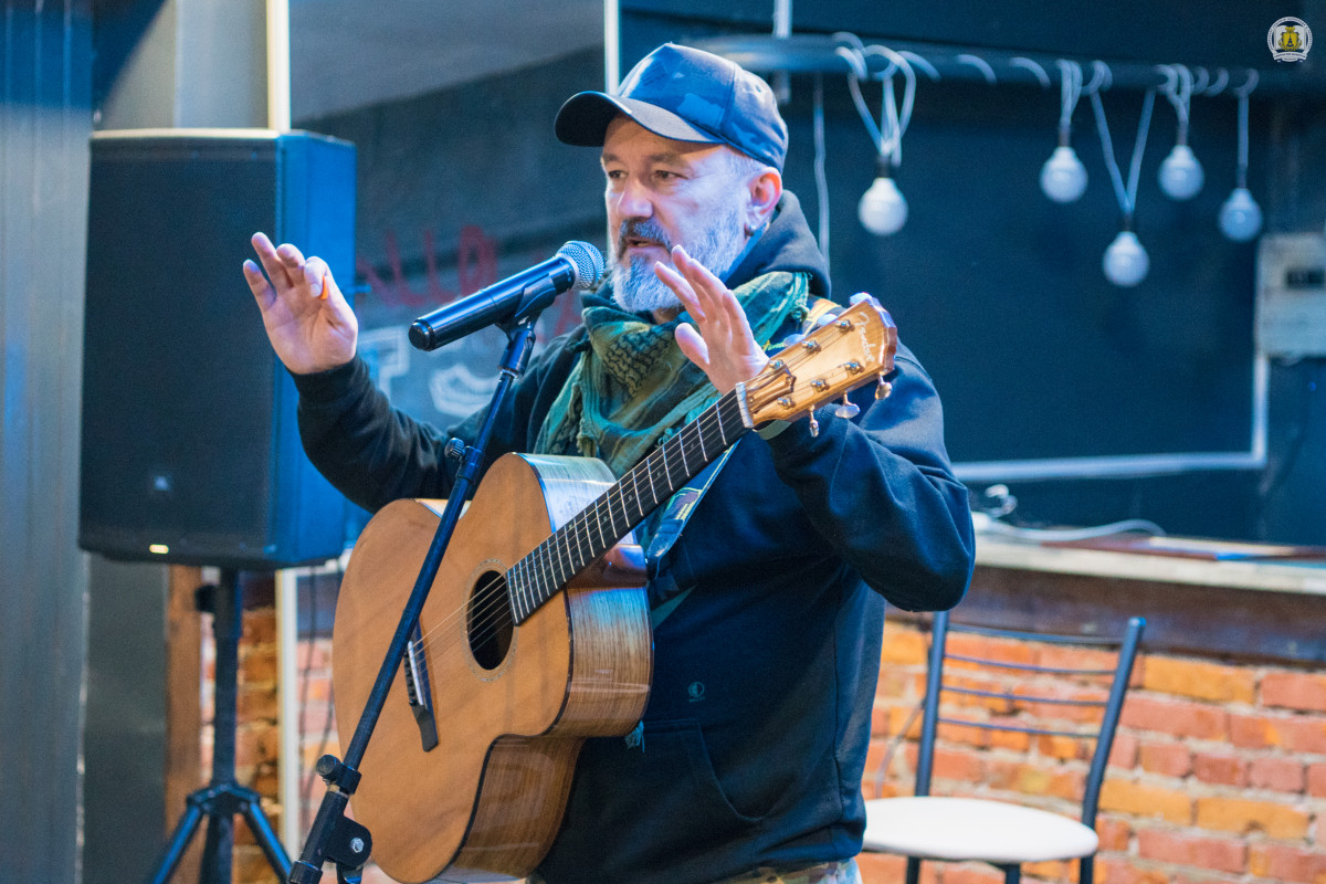 За останні три роки артист проїхав понад 100 000 кілометрів дорогами Донбасу та дав більше тисячі концертів для бійців – аудиторія зустріла цю інформацію щедрою зливою оплесків. Водночас Віталій Кириченко зазначив, що нині за фахом він насамперед військовий: стрілець 130-го батальйону 241-ї бригади, який пройшов бойовий шлях через Київщину, Харківщину та пекельний Бахмут у квітні-травні 2023 року. «Тому в першу чергу я військовослужбовець, а в цивільному житті – рок-музикант», – підкреслив гість.